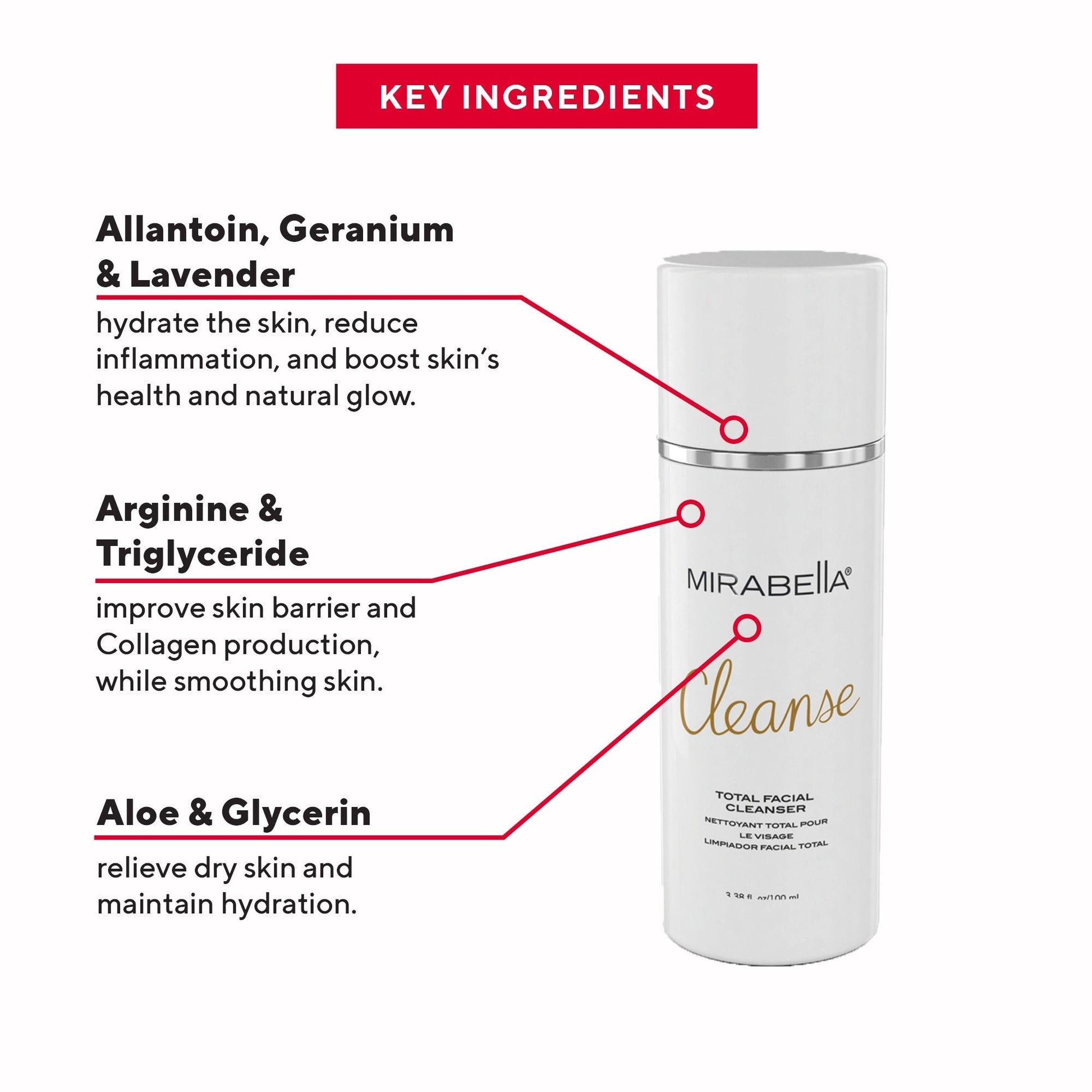 ABOUT: Mirabella Beauty’s Cleanse Total Facial Cleanser is a luxurious, hydrating facial cleanser designed to gently remove makeup, dirt, and impurities while preserving the skin’s natural moisture barrier. Infused with soothing botanicals like Geranium Extract, Lavender, Allantoin, and Aloe, this anti-inflammatory cleanser helps calm redness, nourish sensitive skin, and promote healing for a soft, radiant complexion. Its creamy, non-stripping formula makes it ideal for all skin types, delivering a refreshing cleanse without dryness or tightness. Experience a spa-like cleansing ritual with this skin-loving face wash, perfect for daily use. Shop now to reveal fresh, balanced skin!