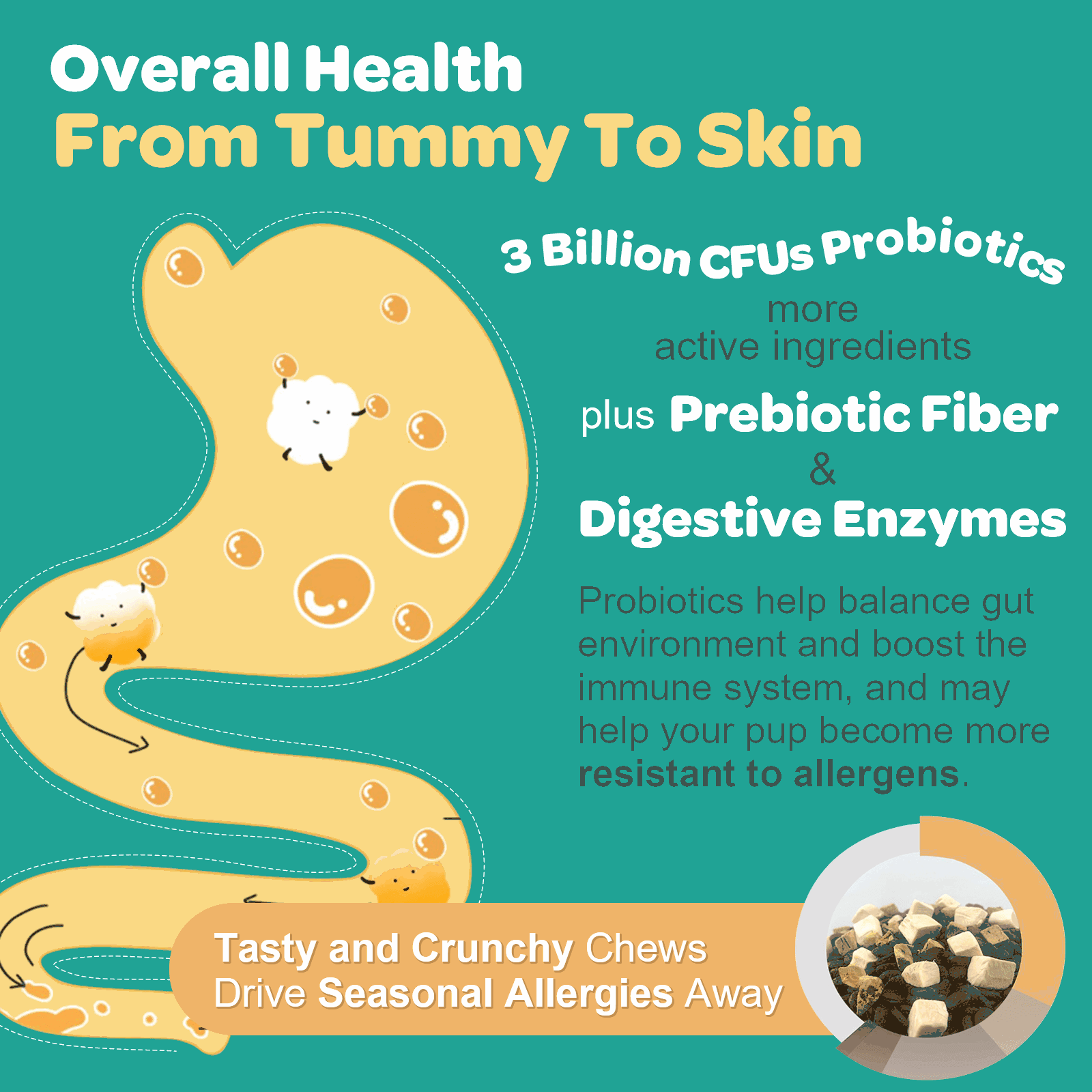 Fortified with Colostrum, 3 billion probiotics, and digestive enzymes, these chews help build a healthy immune system. Probiotics and enzymes improve digestive health, balance gut flora, and increase your dog's immunity, making them more resistant to allergens. The PRP and antibodies in Colostrum help regulate immune responses, moderate allergic reactions, and enhance nutrient absorption, helping your dog stay in peak condition.