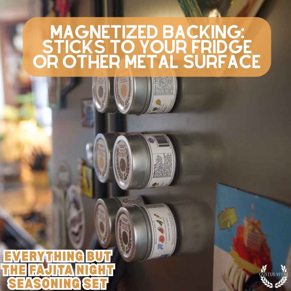 • Magnetized backing: tins sticks to your fridge or other metal surface.