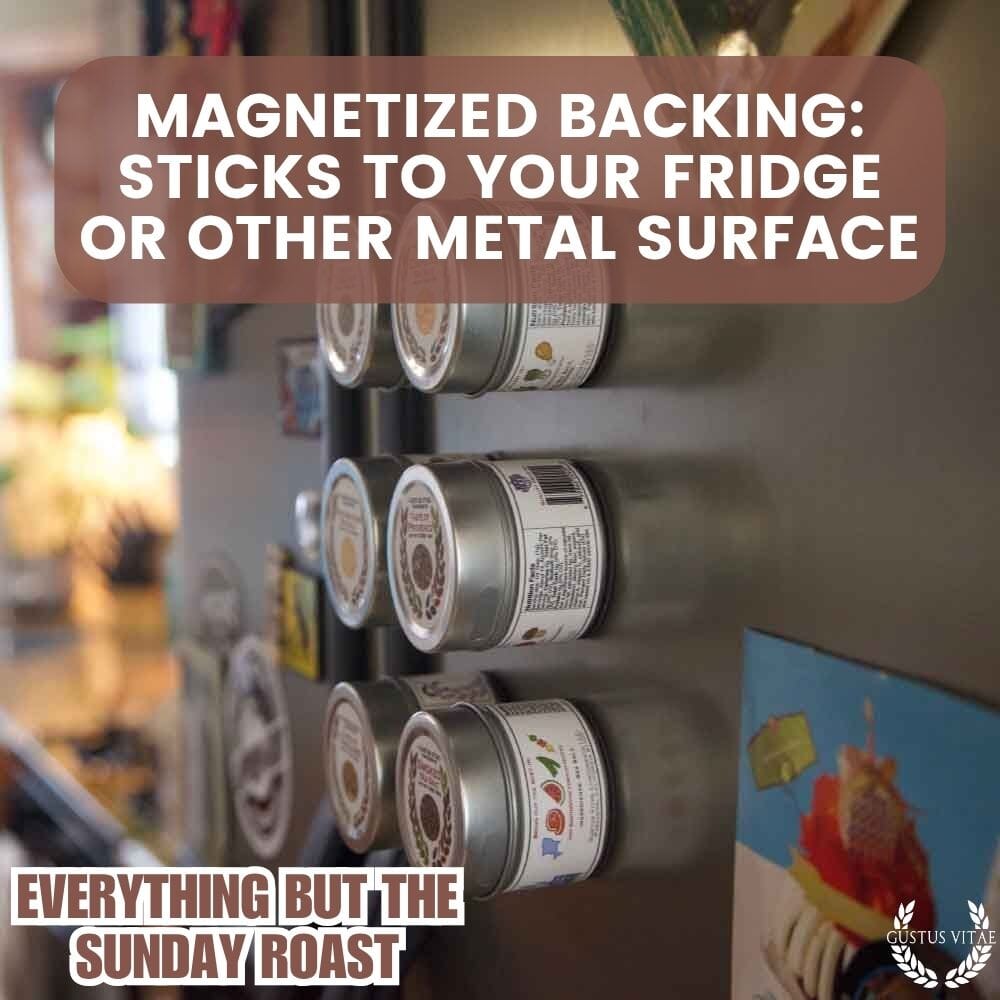 • Magnetized backing: sticks to your fridge or other metal surface.
