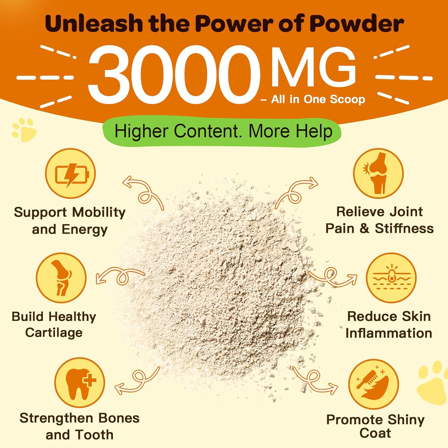 If you’re looking for a more personalized dosage, our dog hip joint supplement is the perfect choice. With a delicious salmon flavor, this powder allows you to adjust the dosage to your dog's individual needs, ensuring they receive the optimal amount of Glucosamine and joint support. It’s a simple and convenient way to ensure your dog gets the nutrition they need for optimal health.