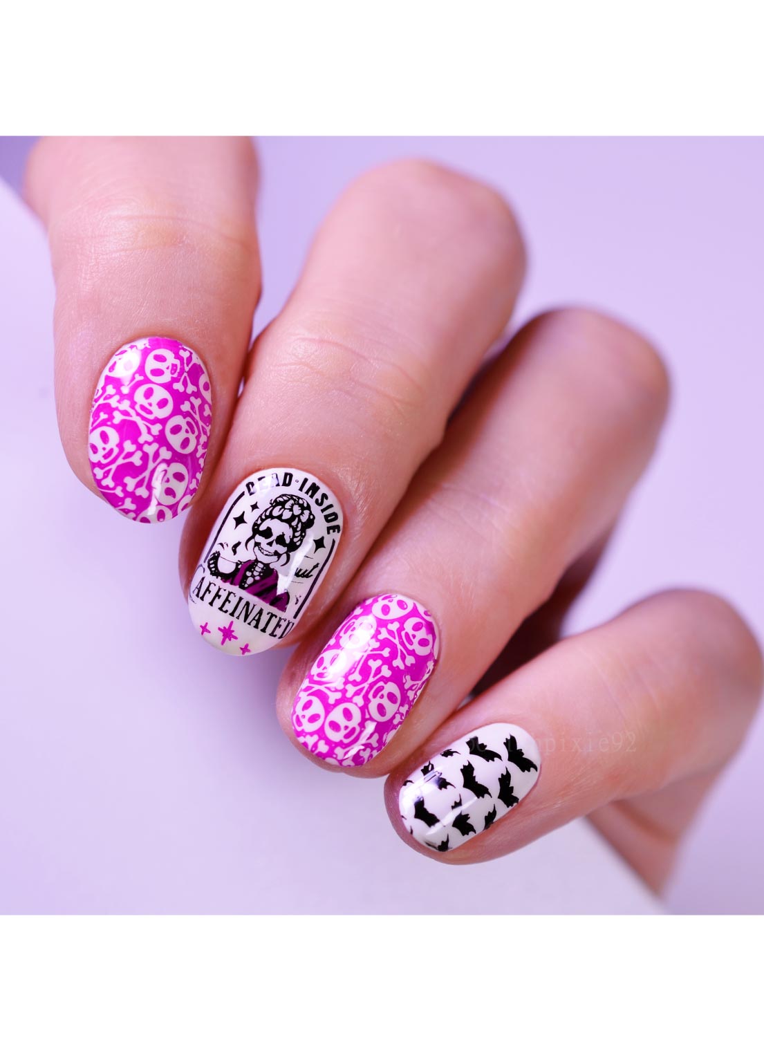 This plate is 9.5 cm by 14.5 cm and has coordinating single images down the center and a few on the sides. Most designs are 17 mm x 21 mm and are built to cover edge-to-edge on even the largest natural nail size. Are small nails left out? Never! Our designs are crafted to not be so overwhelming or large that you can't see what is on your nail - even if it's tiny!