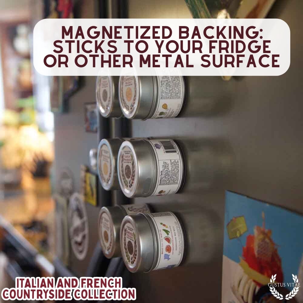 • Magnetized backing: tins sticks to your fridge or other metal surface.