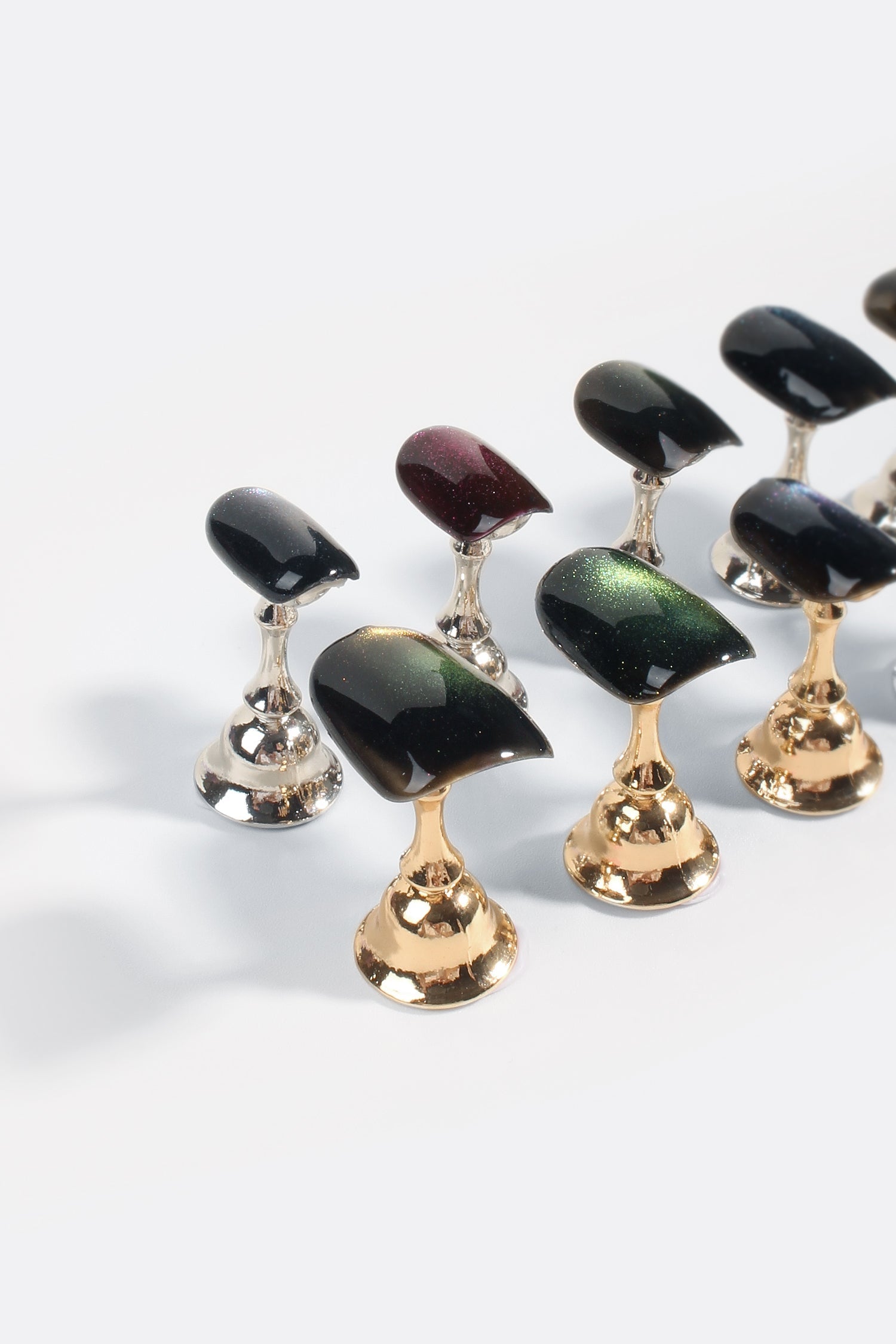 Mystic Aurora handmade nails present a cosmic allure with a glossy black base, reminiscent of a starless night. Swirling over this are iridescent shades that catch the light, creating a dynamic and ethereal effect similar to the fleeting beauty of an aurora. The play of light and shadow gives these nails a mysterious and enchanting look, ideal for adding a touch of otherworldly elegance to one’s appearance.