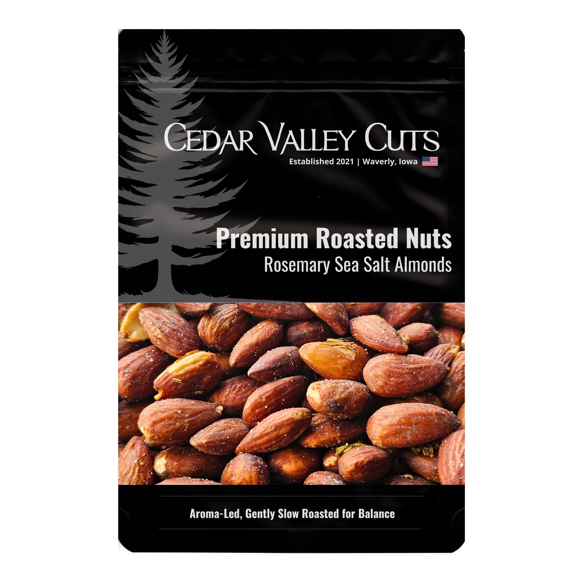 A restrained touch of white pepper and garlic powder adds quiet depth beneath the rosemary, enhancing the toasted almond without drawing attention to itself. Finished with flaky sea salt while still warm, each bite delivers clean crunch, savory balance, and a lingering herbal finish.