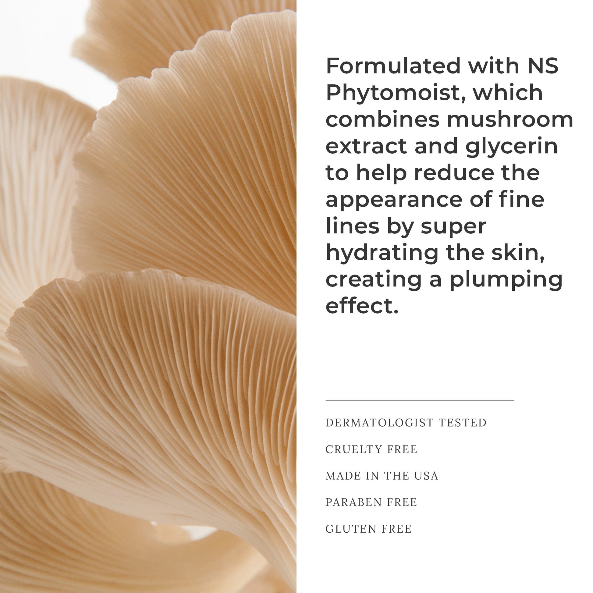 The newest holy grail ingredient NS Phytomoist combines mushroom extract and glycerin to help reduce the appearance of fine lines and wrinkles by super hydrating the skin creating a puffing effect. Peptides and Licorice Extract help calm and protect.