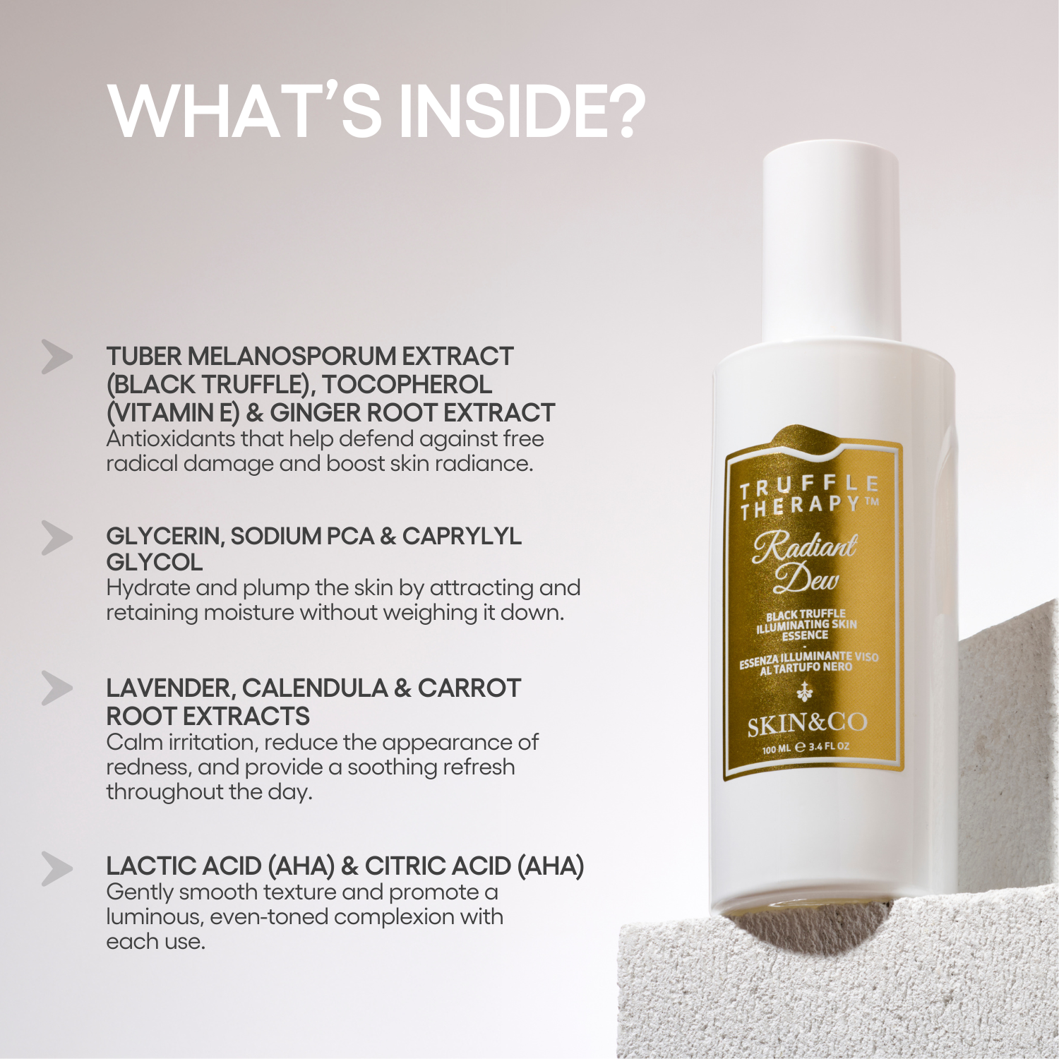 This multi-purpose face mist hydrates, tones, and refreshes with Black Truffle from Umbria, ginger, hyaluronic acid, and botanicals. It refines pores, energizes tired skin, and protects against environmental stress, leaving a plump, luminous, and radiant complexion. Perfect as a toner, setting spray, or mid-day refresh.