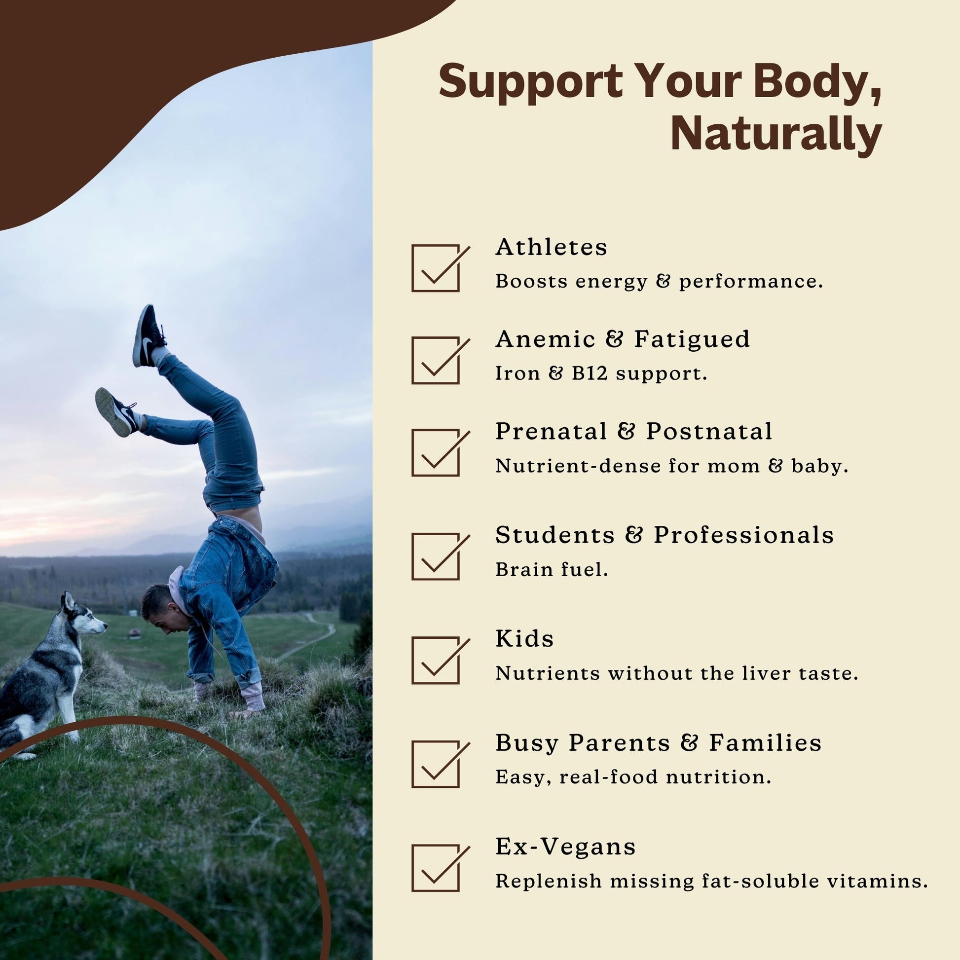 Sourced from grass-fed, pasture-raised cattle, our freeze-dried process ensures maximum nutrient retention. No hormones, GMOs, or fillers—just pure, ancestral nutrition.