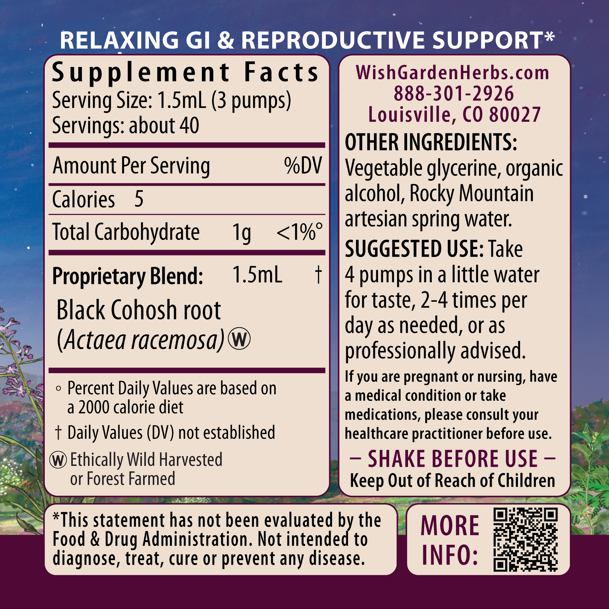 • Black Cohosh root: Actaea racemosa is commonly used to ease muscle discomfort, irritability, sleep disturbances and supports the balance of hormones. It supports a healthy inflammatory response and helps calm and relax the muscles throughout the body and joints, and is most often used to ease cramps and menopausal discomforts such as night sweats, hot flashes, irritability, and sleep disturbances.