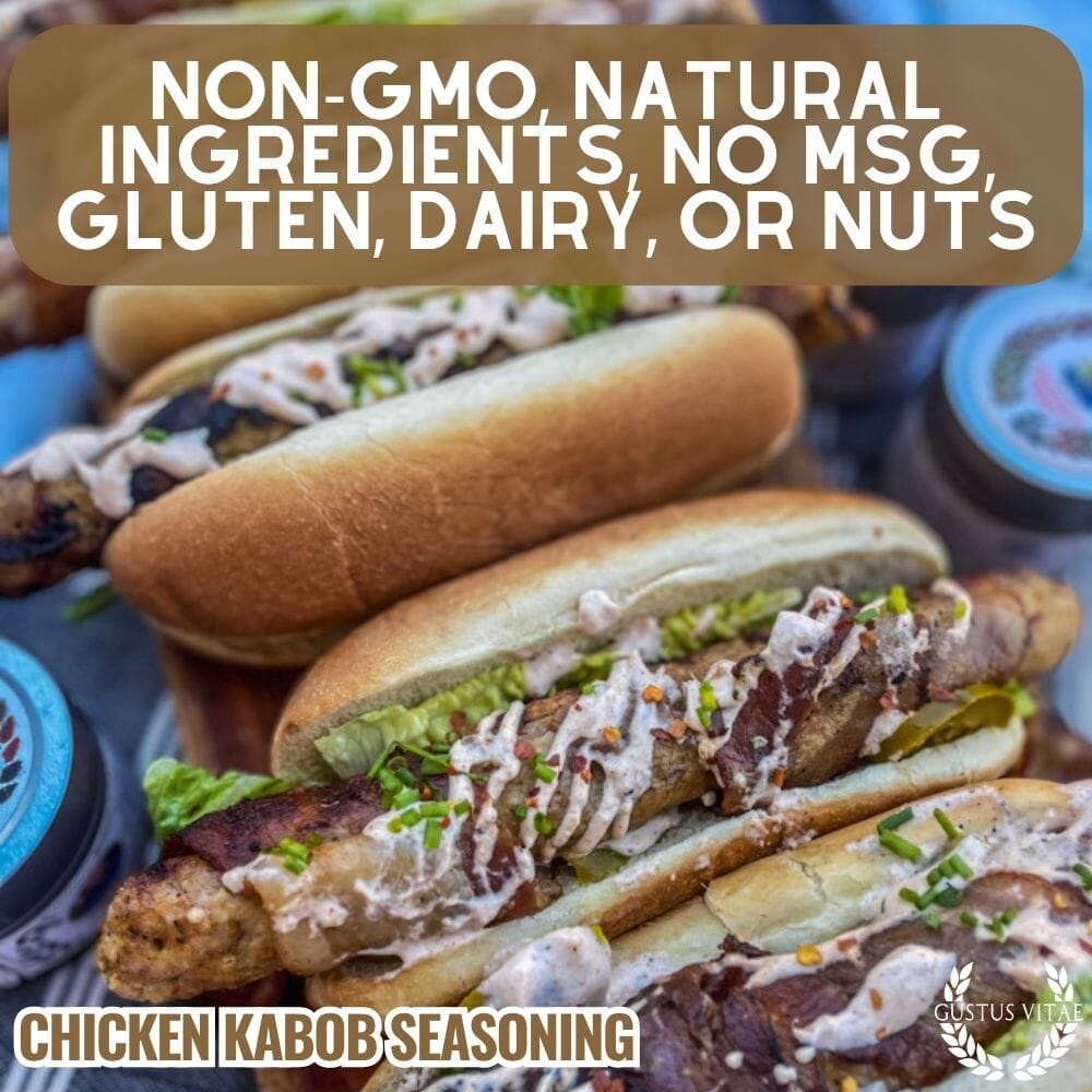El condimento para brochetas de pollo contiene: ajo, cebolla, sal marina, pimienta negra, pimentón, azúcar de caña, perejil, orégano, tomillo, apio molido, cayena roja, hojuelas de pimiento rojo, pimiento morrón rojo, chile ancho, cilantro, ralladura de naranja, jengibre, canela, limón, mejorana.