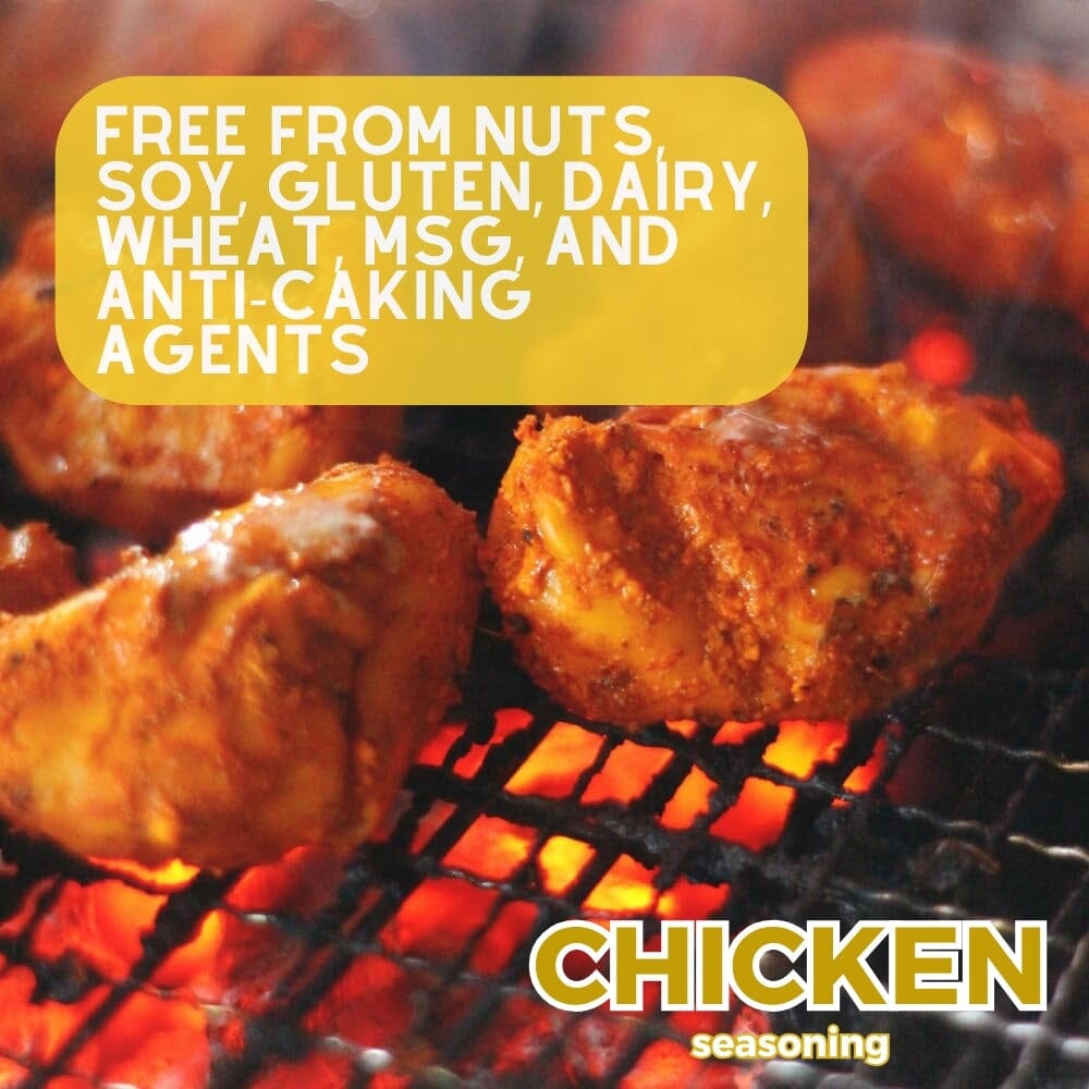 Everything But The Chicken Seasoning Contains: Garlic, Onion, California Sea Salt, Black Pepper, Paprika, Sugar, Celery Seed, Black Pepper, White Pepper, Hickory Smoke, Basil, Oregano, Rosemary, Thyme, Marjoram, Parsley, Red Cayenne, Red Pepper, Dill Tips, Chives, Chervil, Tarragon, Orange Zest.