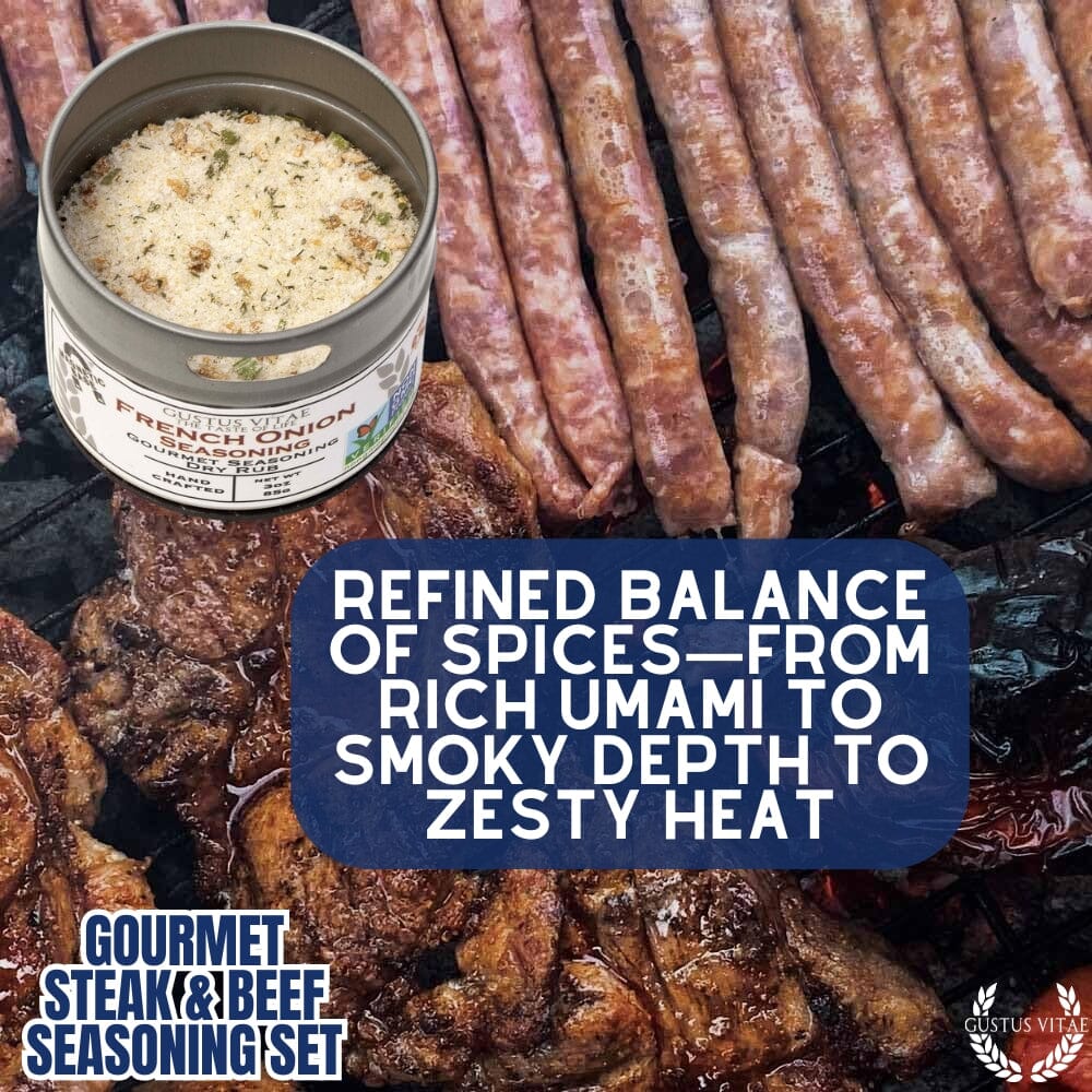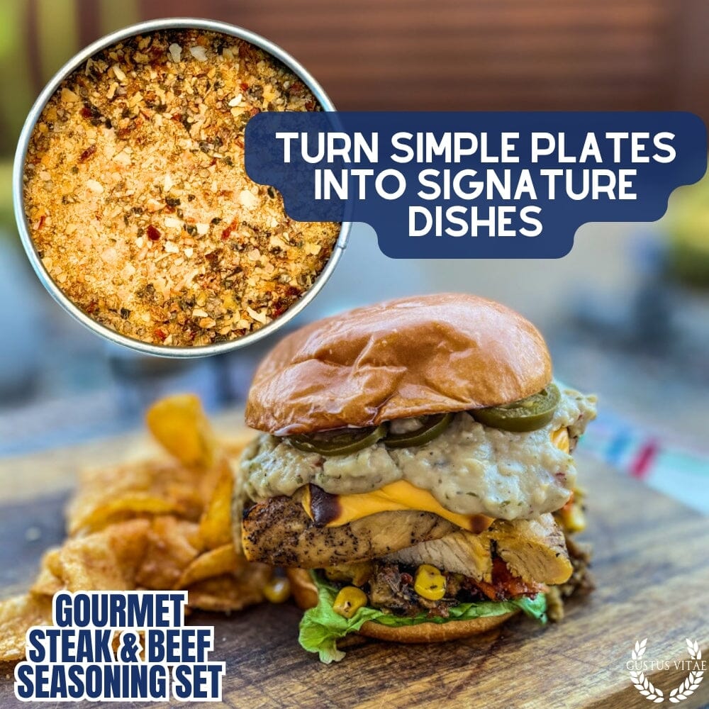 Dígale adiós a los condimentos viejos y sosos para sus filetes y platos de carne, y agregue un sabor serio y un toque gourmet a su juego de cocina con esta hermosa colección curada de 6 mezclas de especias y adobos gourmet.