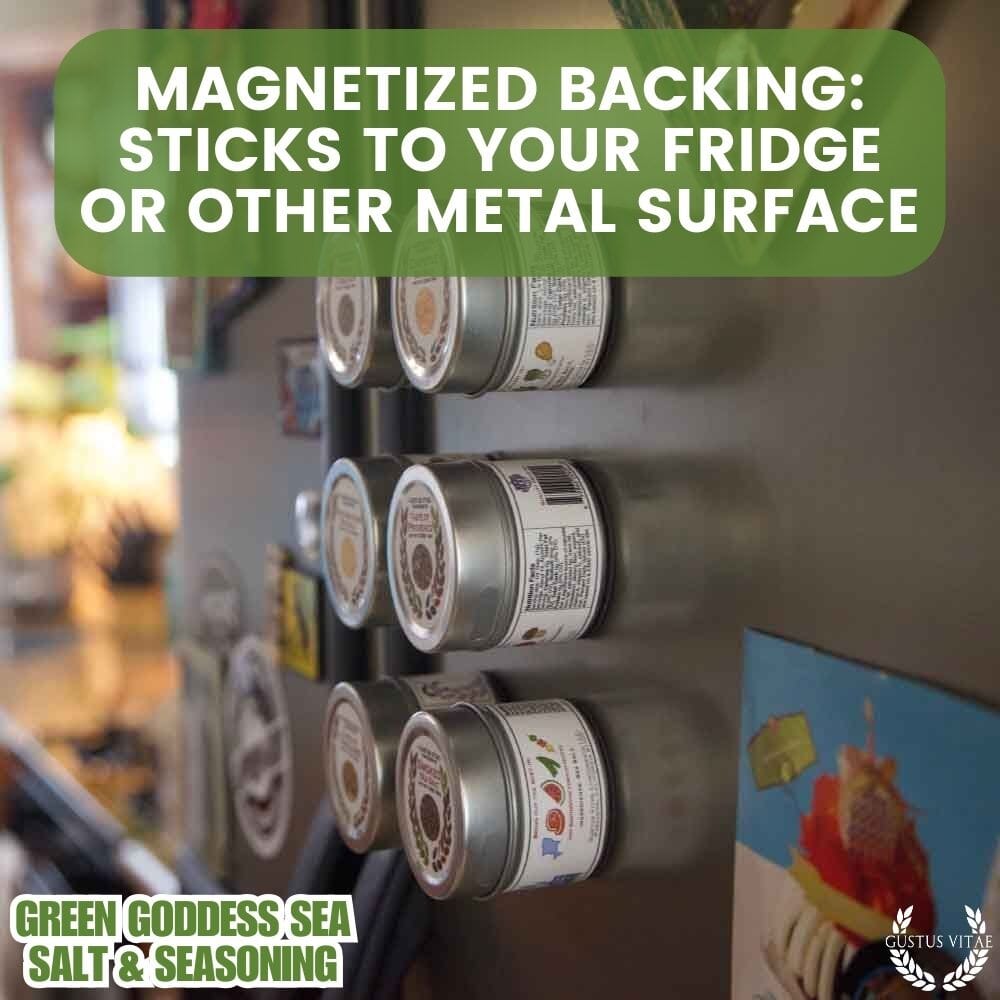 Green Goddess ha sido nuestro aderezo predilecto para ensaladas desde hace mucho tiempo, así que era solo cuestión de tiempo antes de que decidiéramos destilar uno de nuestros sabores favoritos en una sal condimentada gourmet. Rica en hierbas, con un delicioso toque ácido de la crema agria, este es uno de esos condimentos que solemos usar en todo. Claro, es perfecto para una salsa instantánea al mezclarlo con crema agria, requesón o yogur griego, y por supuesto, es maravilloso para añadir sabores cítricos a ensaladas ligeras de verano: solo rocía un poco de aceite de oliva y una pizca de condimento Green Goddess antes de servir y disfruta de un aderezo perfecto sin la pesadez ni las calorías del aderezo tradicional. Nos encanta este condimento para papas horneadas dos veces y verduras asadas al horno, y es nuestro ingrediente secreto para el puré de coliflor que hará que tus invitados vuelvan por tercera y cuarta vez. ¡Hemos aprendido a hacer siempre de más! Base magnética: los envases se adhieren al refrigerador u otra superficie metálica.
