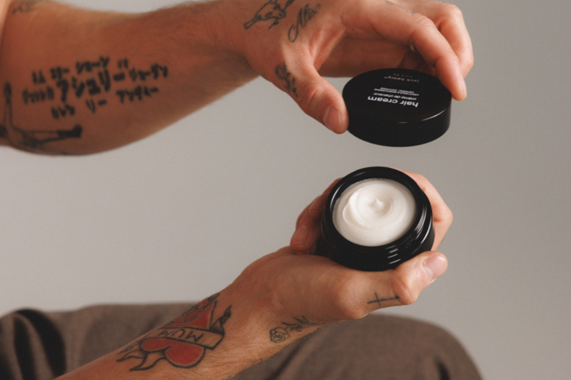 scoop a small amount of hair cream out of the jar. compound hair cream by rubbing between fingers and spreading evenly through hands. apply to hair, working through roots for full distribution. repeat if needed. style can be played with throughout the day.