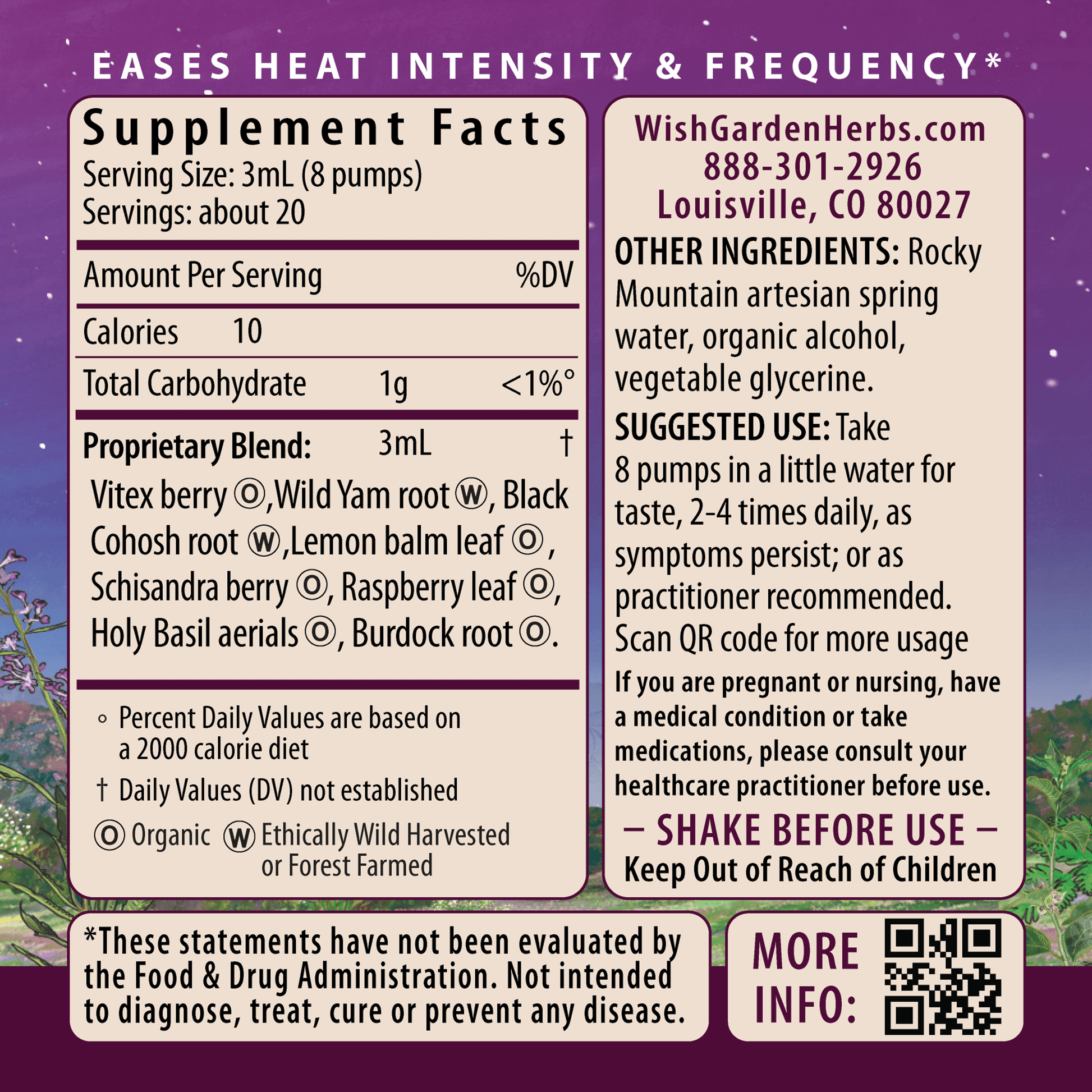 Organic Vitex berry (Vitex agnus-castus), Wild Yam root (Dioscorea villosa), Black Cohosh root (Actaea racemosa (syn. Cimicifuga racemosa)), organic Lemon Balm leaf (Melissa officinalis), organic Schisandra berry (Schisandra chinensis), organic Raspberry leaf (Rubus idaeus), organic Holy Basil (Tulsi) aerials (Ocimum spp.), organic Burdock root (Arctium lappa), Rocky Mountain artesian spring water, organic gluten-free alcohol & vegetable glycerine.