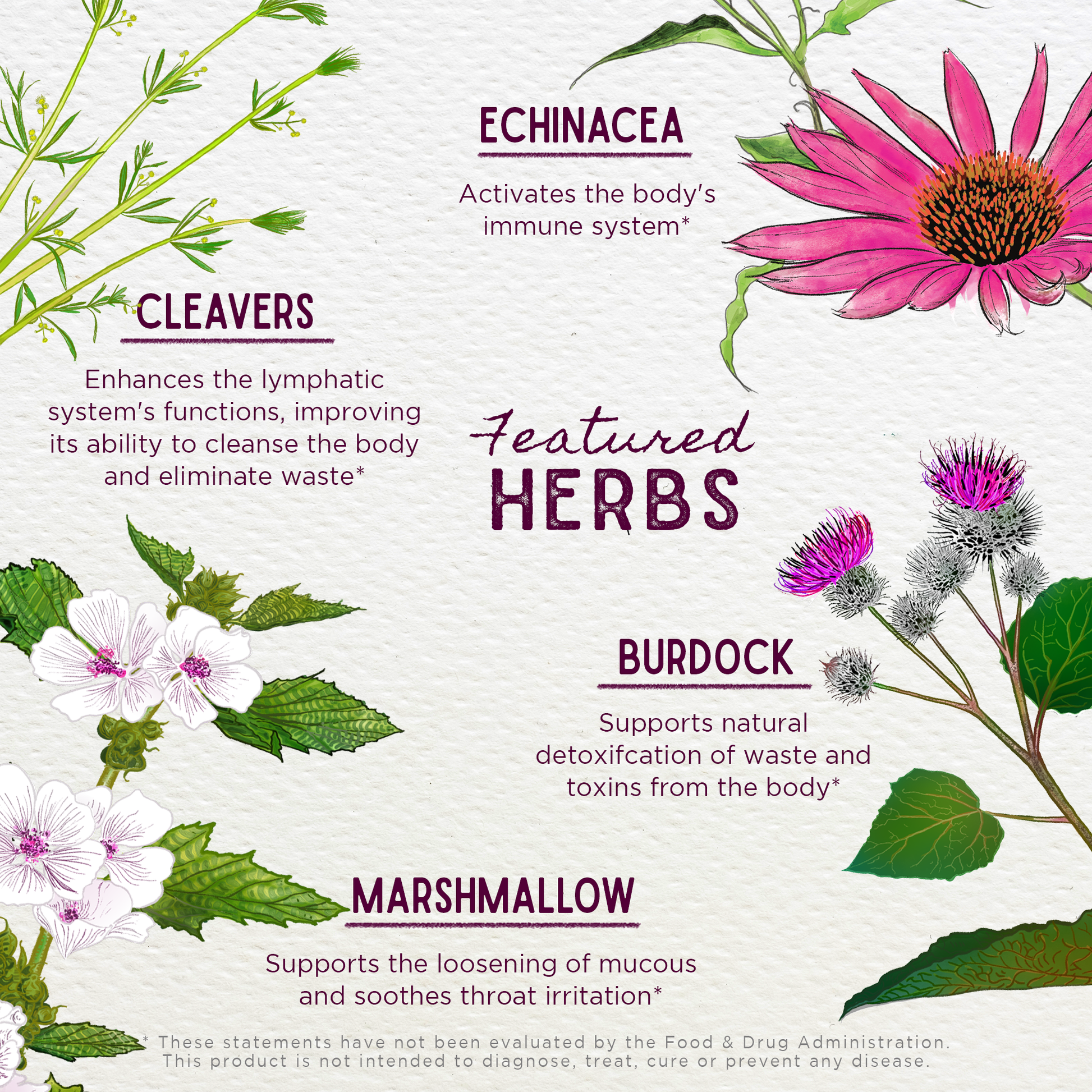 Organic Echinacea purpurea root (Echinacea purpurea), Echinacea angustifolia root (Echinacea angustifolia), organic Burdock root (Arctium lappa), organic Cleavers aerials (Galium aparine), organic Marshmallow root (Althaea officinalis), vegetable glycerine, Rocky Mountain artesian spring water, organic apple cider vinegar & organic gluten-free alcohol.