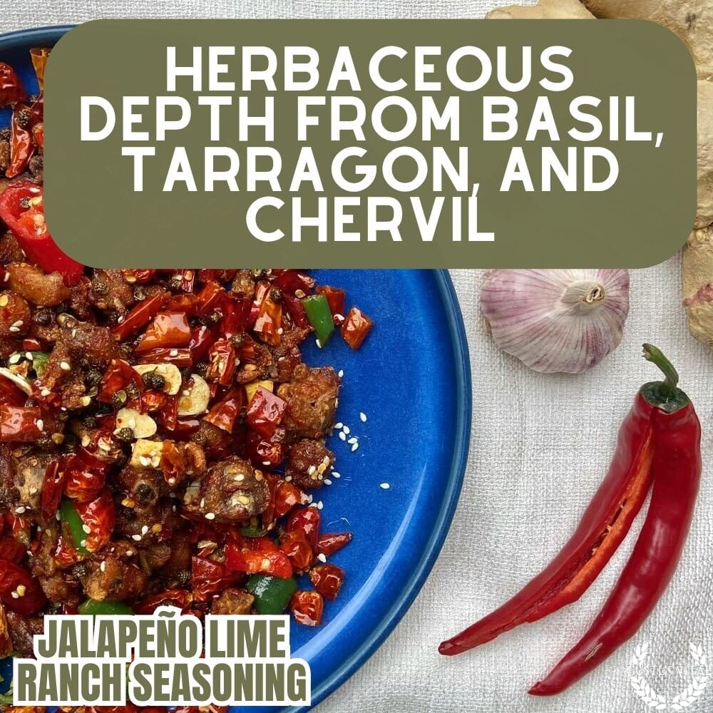 El condimento ranchero de jalapeño y limón contiene: sal marina, cebolla, azúcar, crema agria en polvo, queso azul en polvo (leche, sal, cultivos, enzimas), jalapeño, jugo de limón, sal marina gruesa, puntas de eneldo, cebollino, ajo, albahaca, perifollo, estragón, lima kaffir, pimienta blanca, perejil.