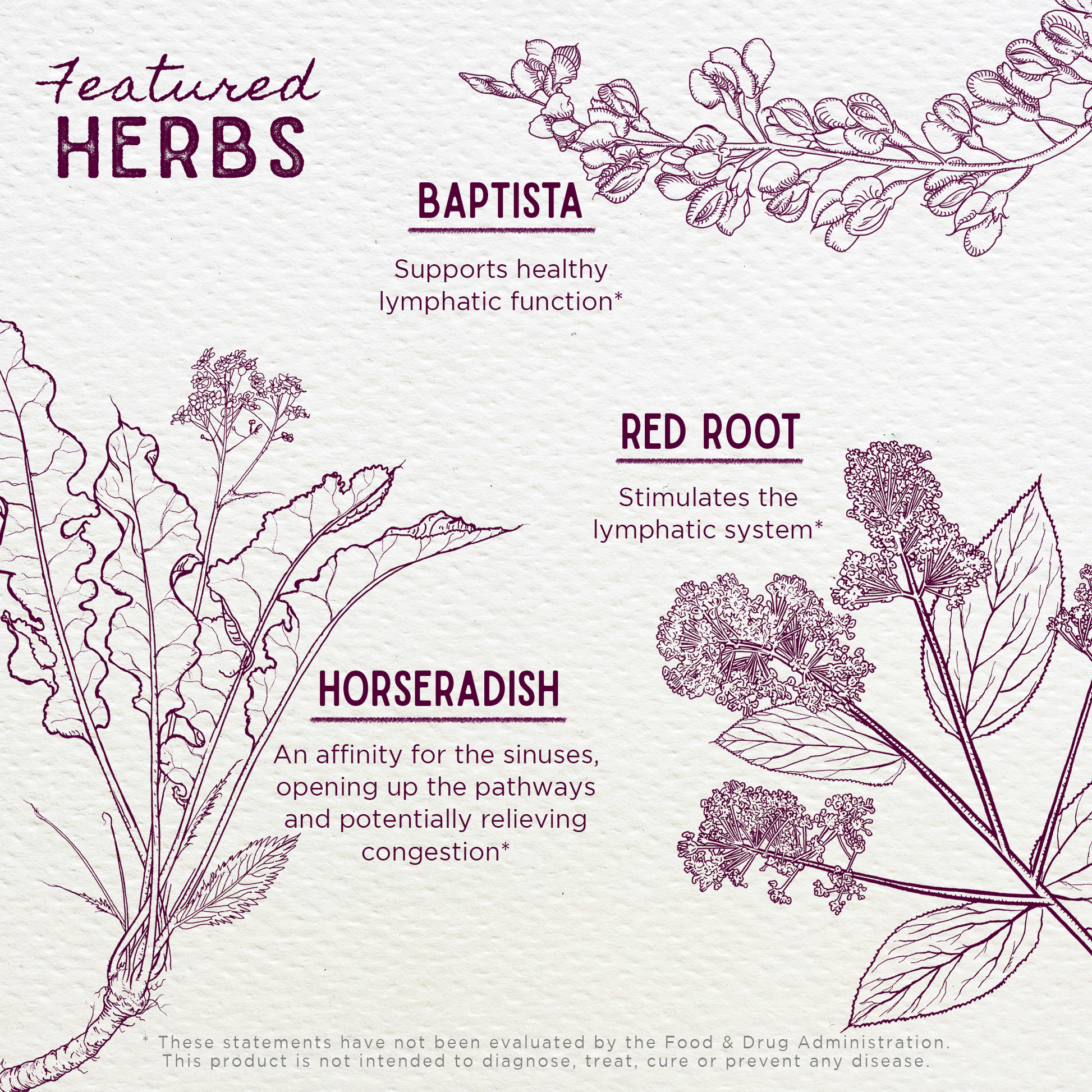 • Baptisia root: Baptisia tinctoria, also known as Wild Indigo, is native to the Northeastern United States and supports healthy lymphatic function, carrying immune properties into the nooks and crannies of the head.