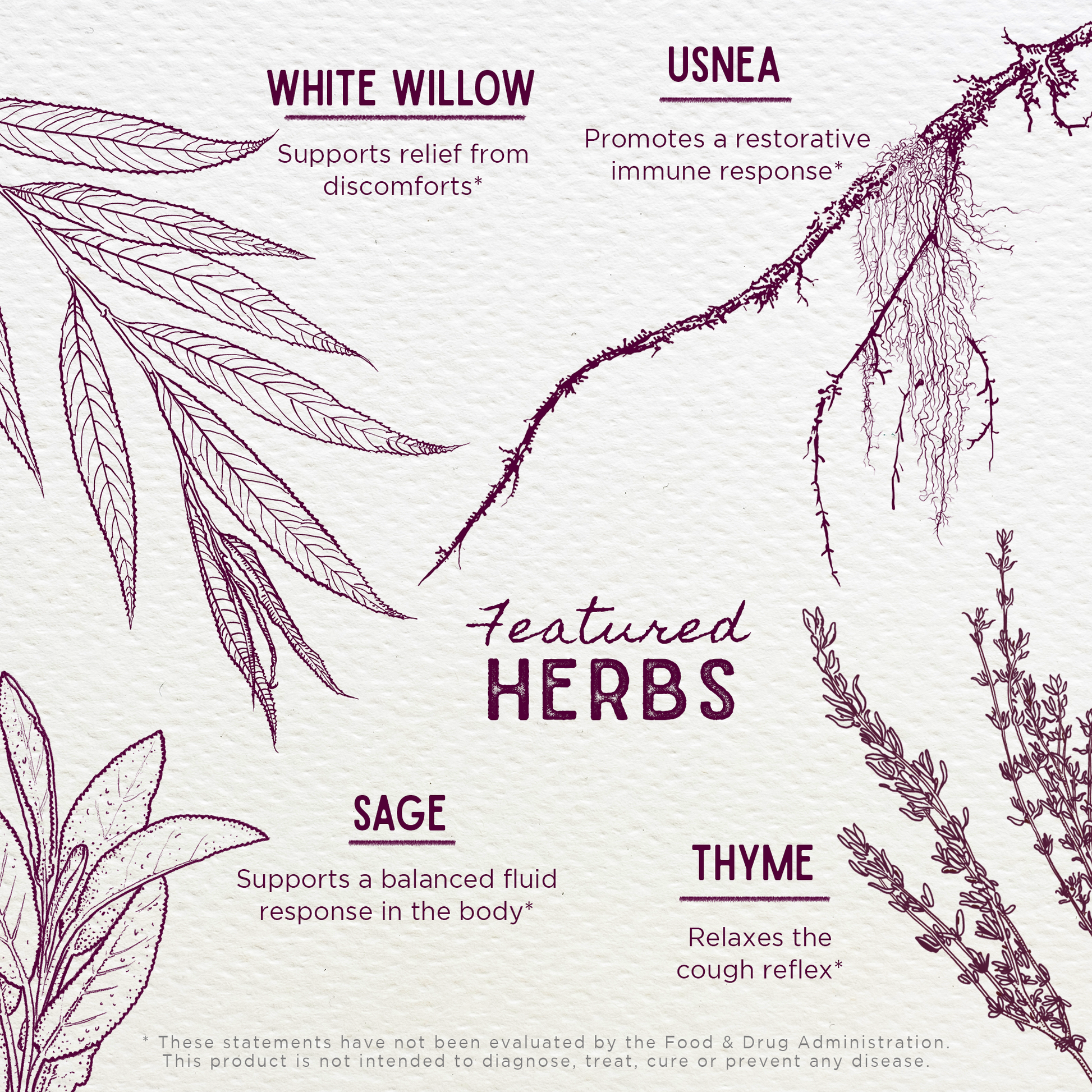 • Thyme leaf: Thymus vulgaris may help soothe occasional cough, supports immune system function, and provides free radical scavenger activity.