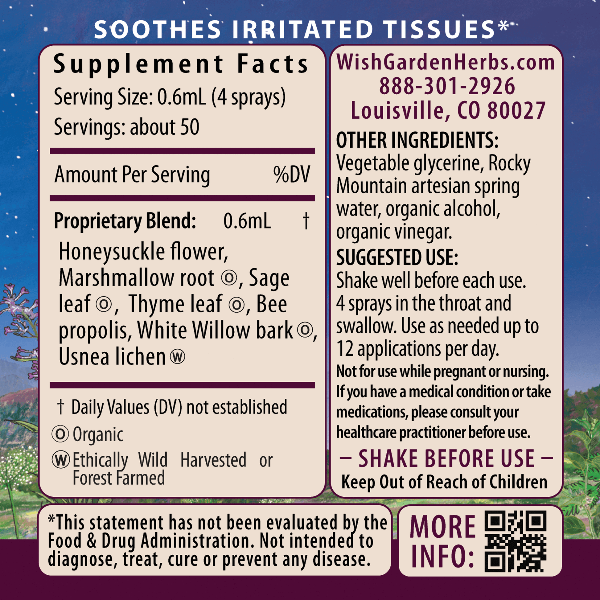 Honeysuckle Japanese flower (Lonicera japonica), organic Marshmallow root (Althaea officinalis), organic Sage leaf (Salvia officinalis), organic Thyme leaf (Thymus vulgaris), Bee Propolis, organic White Willow bark (Salix alba), Usnea lichen (Usnea spp.), vegetable glycerine, Rocky Mountain artesian spring water, organic gluten-free alcohol & organic apple cider vinegar.