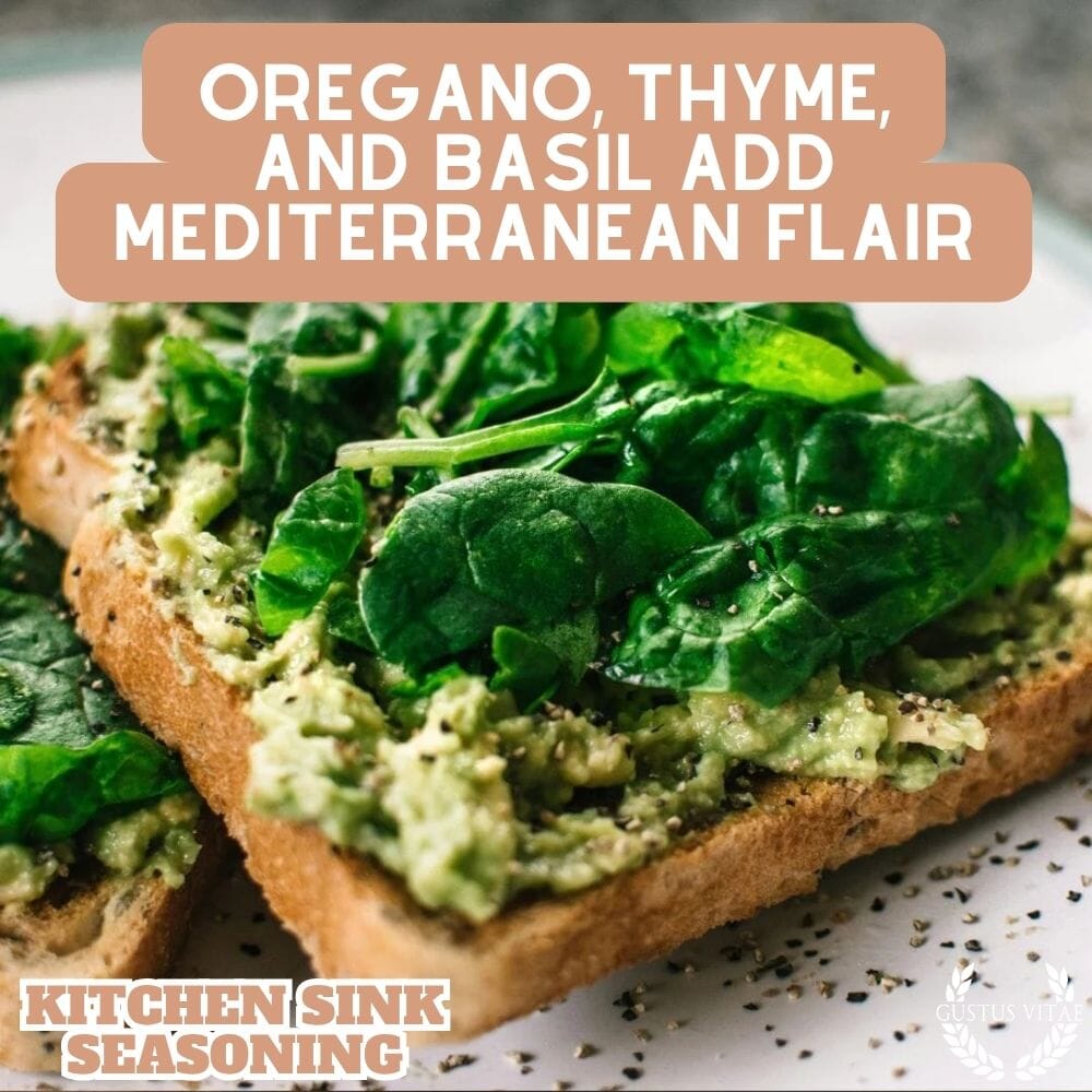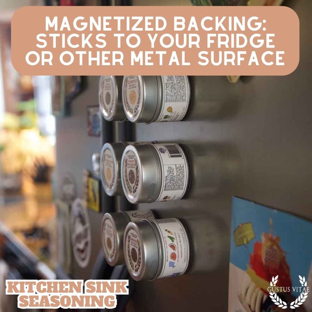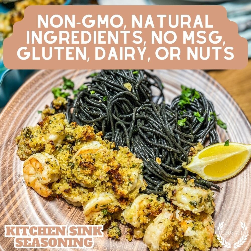 El condimento para fregadero de cocina contiene : Sal marina, ajo picado, cebolla, azúcar, puntas de eneldo, cebollino, albahaca, perifollo, estragón, pimienta blanca, perejil, pimienta negra, pimiento rojo, semillas de sésamo, semillas de amapola, orégano, tomillo, semillas de apio molidas, pimiento rojo, pimentón, polvo de humo de nogal, pimentón español, cayena, hojas de albahaca, romero.
