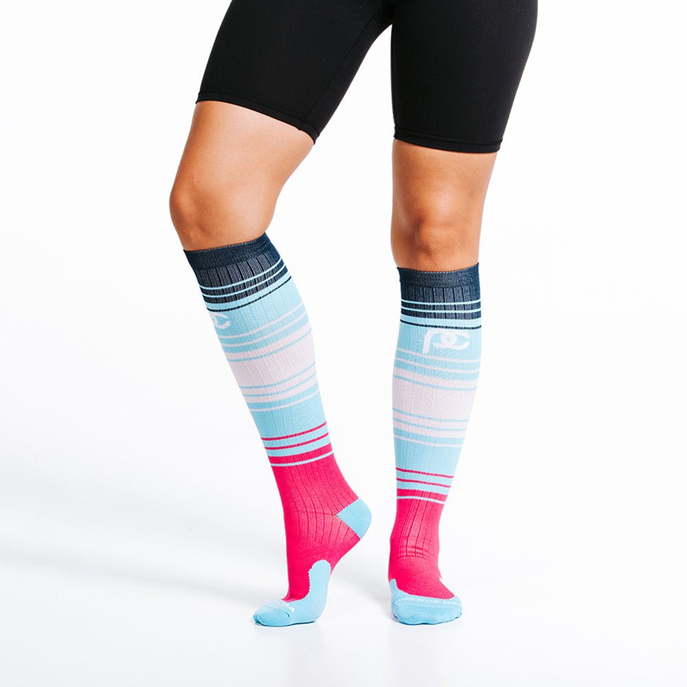 One of our most popular designs, these over-the-calf colorful compression socks have gorgeous blue and pink hues reminiscent of Summer sunsets on the bayou!