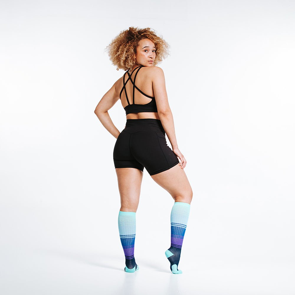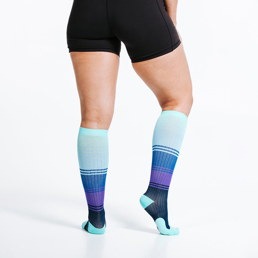 Part of our State of Mind Collection, these inspired knee-high compression socks feature various hues of water visible throughout the Land of 10,000 lakes. Now available in new Wide Calf sizes.