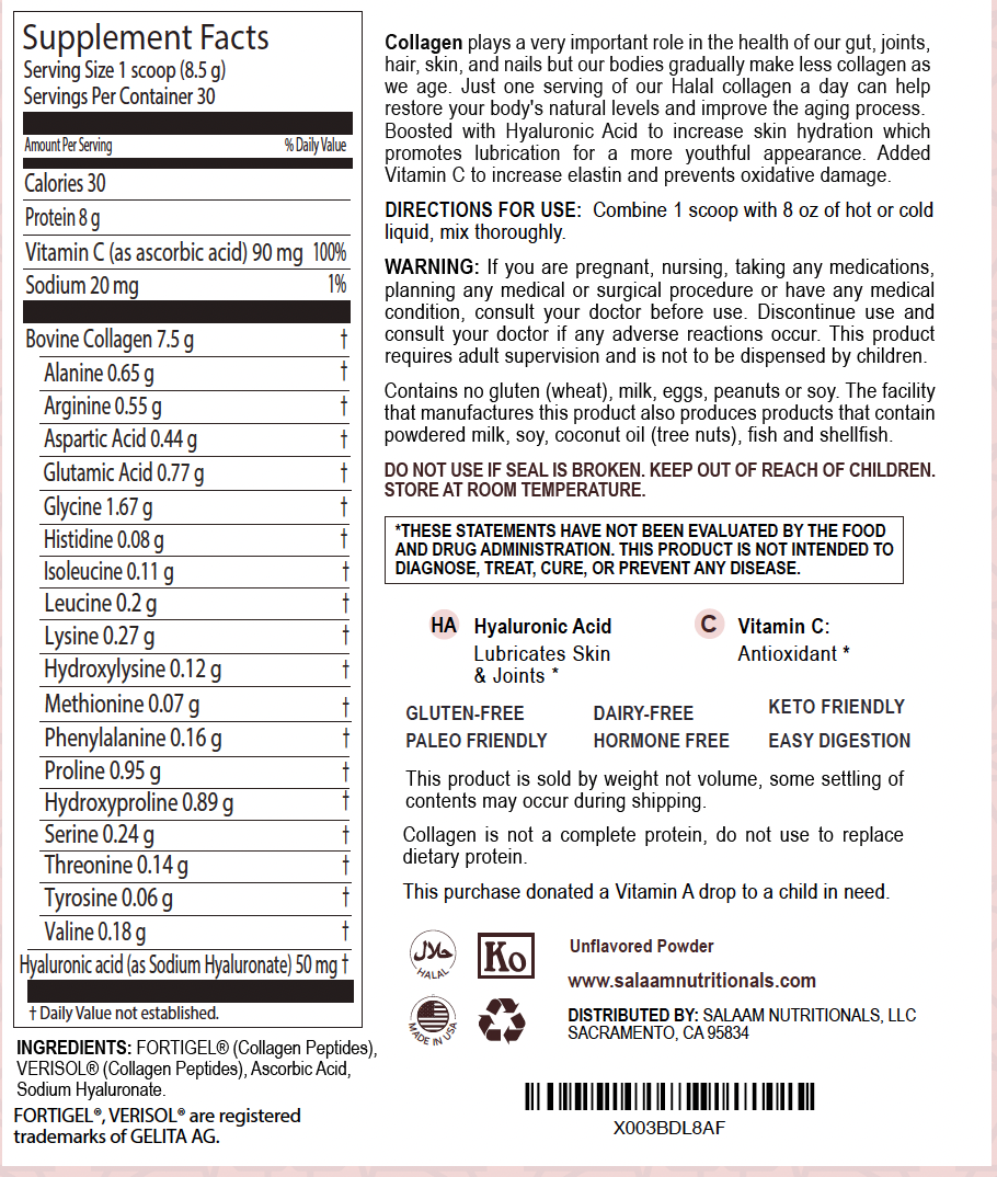Pure Halal Collagen Hydrolyzed Peptides Type 1 & 3 Powder - With Vitamin C & Hyaluronic Acid | Salaam Nutritionals