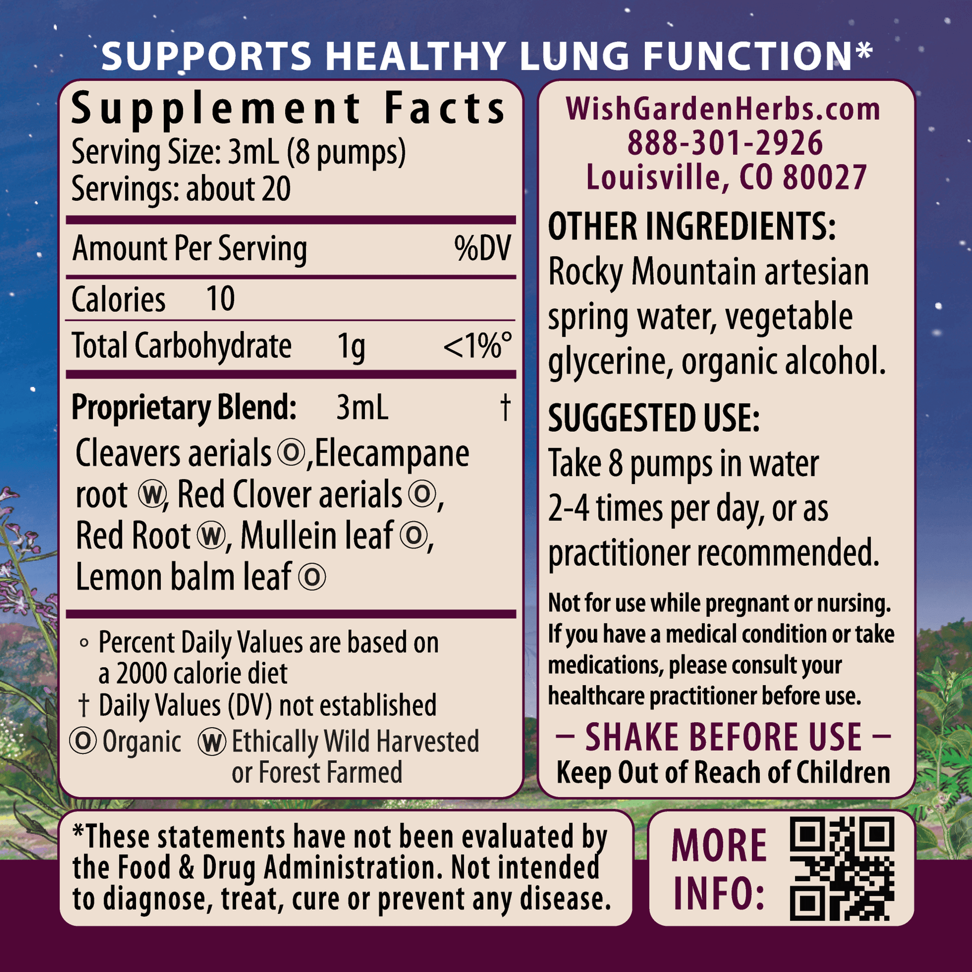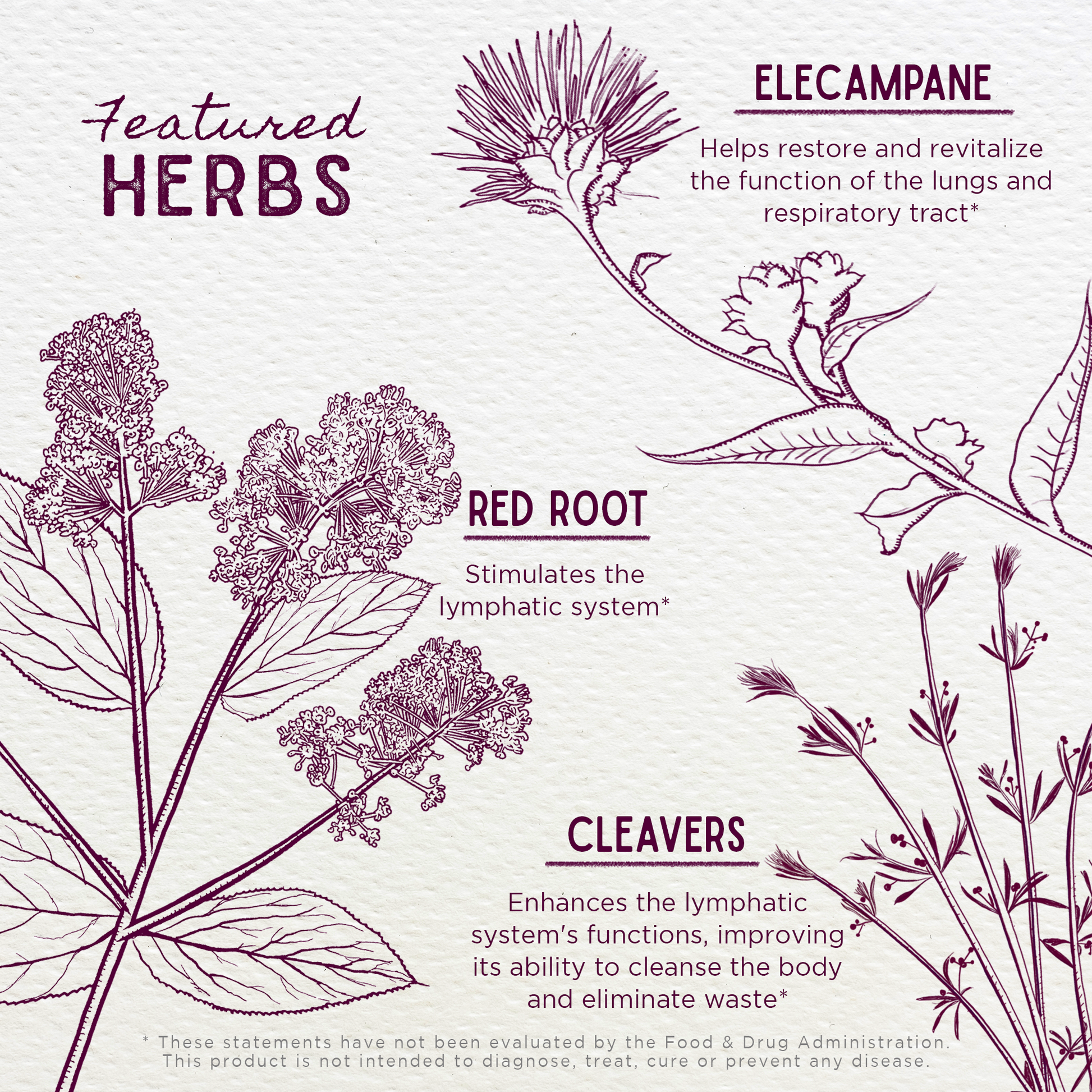 Organic Cleavers aerials (Galium aparine), Elecampane root (Inula helenium), organic Red Clover aerials (Trifolium Pratense), Red Root (Ceanothus americanus), organic Mullein leaf (Verbascum spp. (V. thapsus, V. densiflorum, V. sinuatum)), organic Lemon Balm leaf (Melissa officinalis), Rocky Mountain artesian spring water, vegetable glycerine & organic gluten-free alcohol.