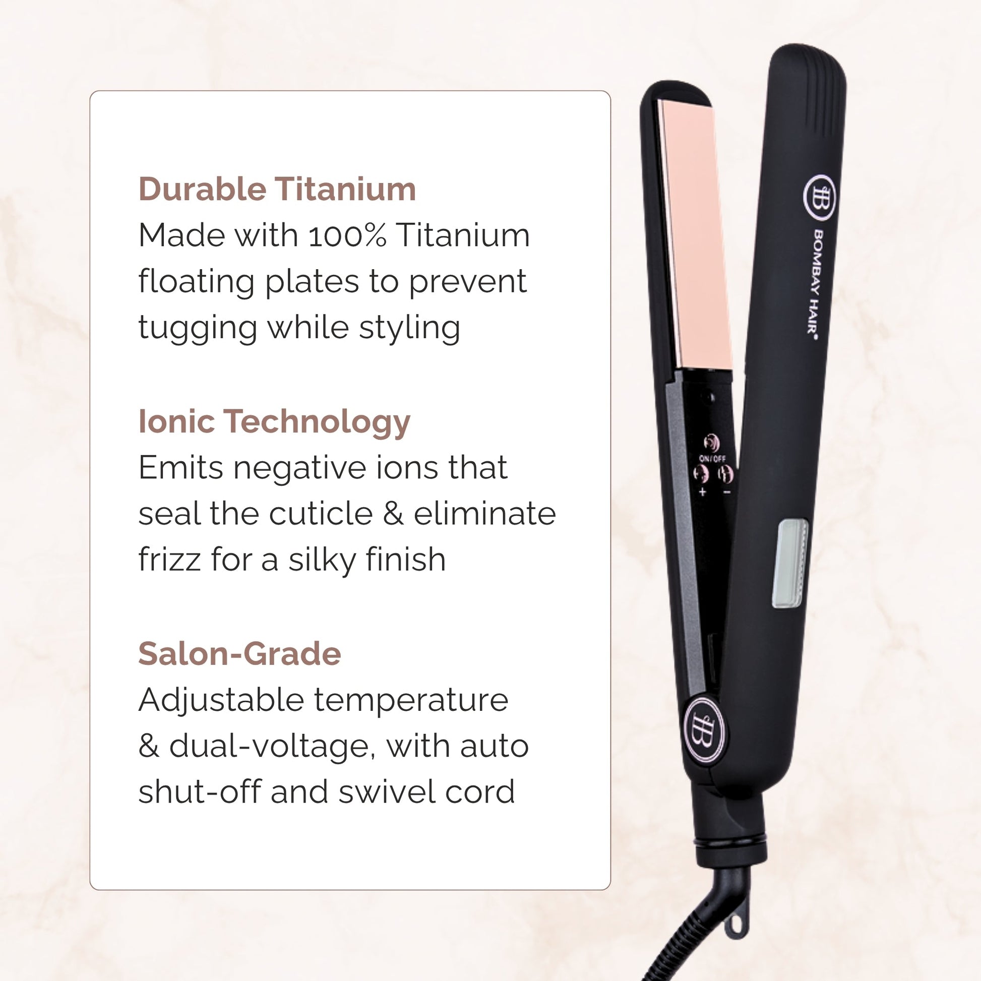 With the Bombay Rose Gold Digital Styler you can create silky smooth strands, tousled waves, or bombshell curls with ease. Rose Gold Flat Iron Hair Straightener is lightweight and made with 100% titanium plates in a rose gold finish which allows for smoother, faster and effortless styling in just one easy pass.