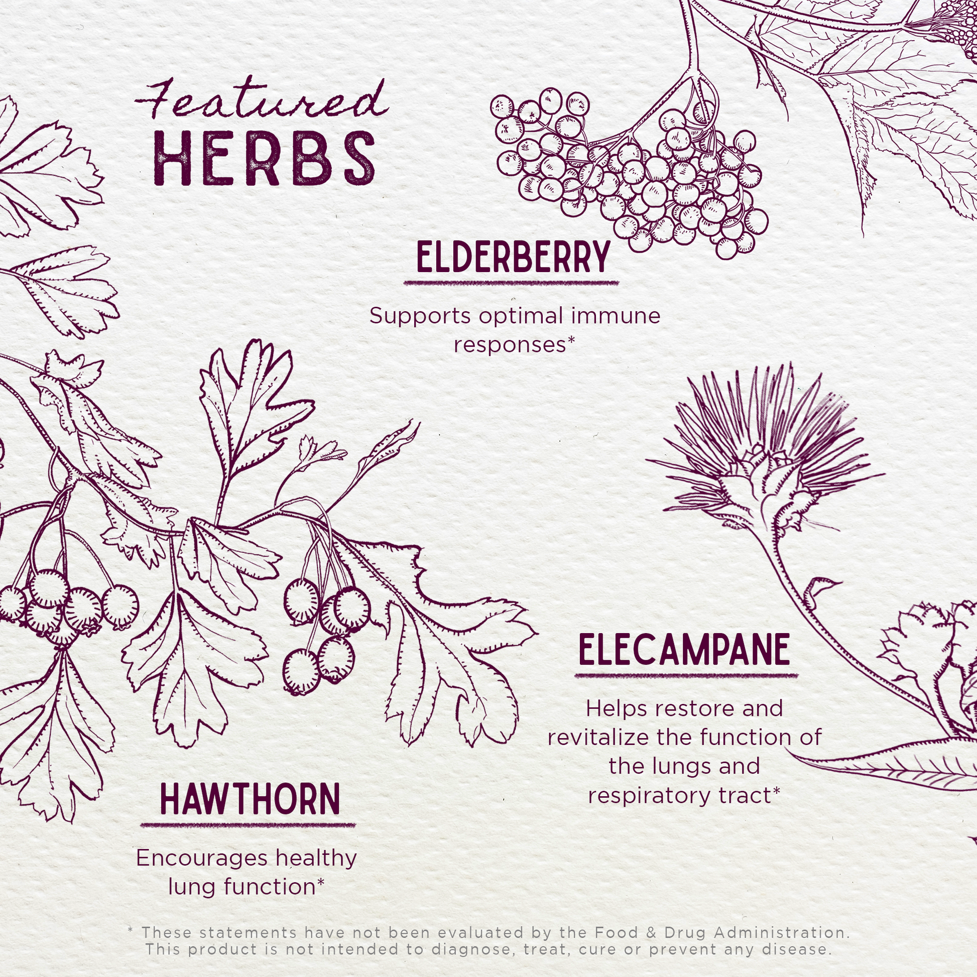 • Elecampane root: The root of Inula helenium supports comfortable breathing and respiratory wellness. Elecampane root nourishes healthy lung function and promotes overall respiratory performance.