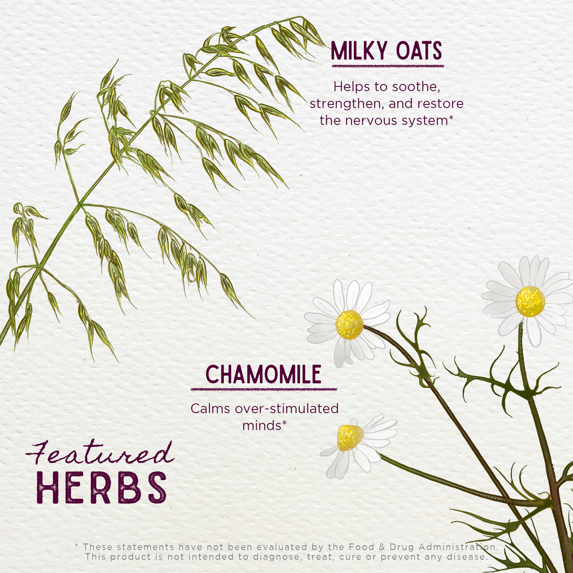 • Chamomile flower: Matricaria recutita is commonly used to promote relaxation by gently calming the nervous system and supporting a healthy stress response. Chamomile may also help support a balanced inflammatory response throughout the body.