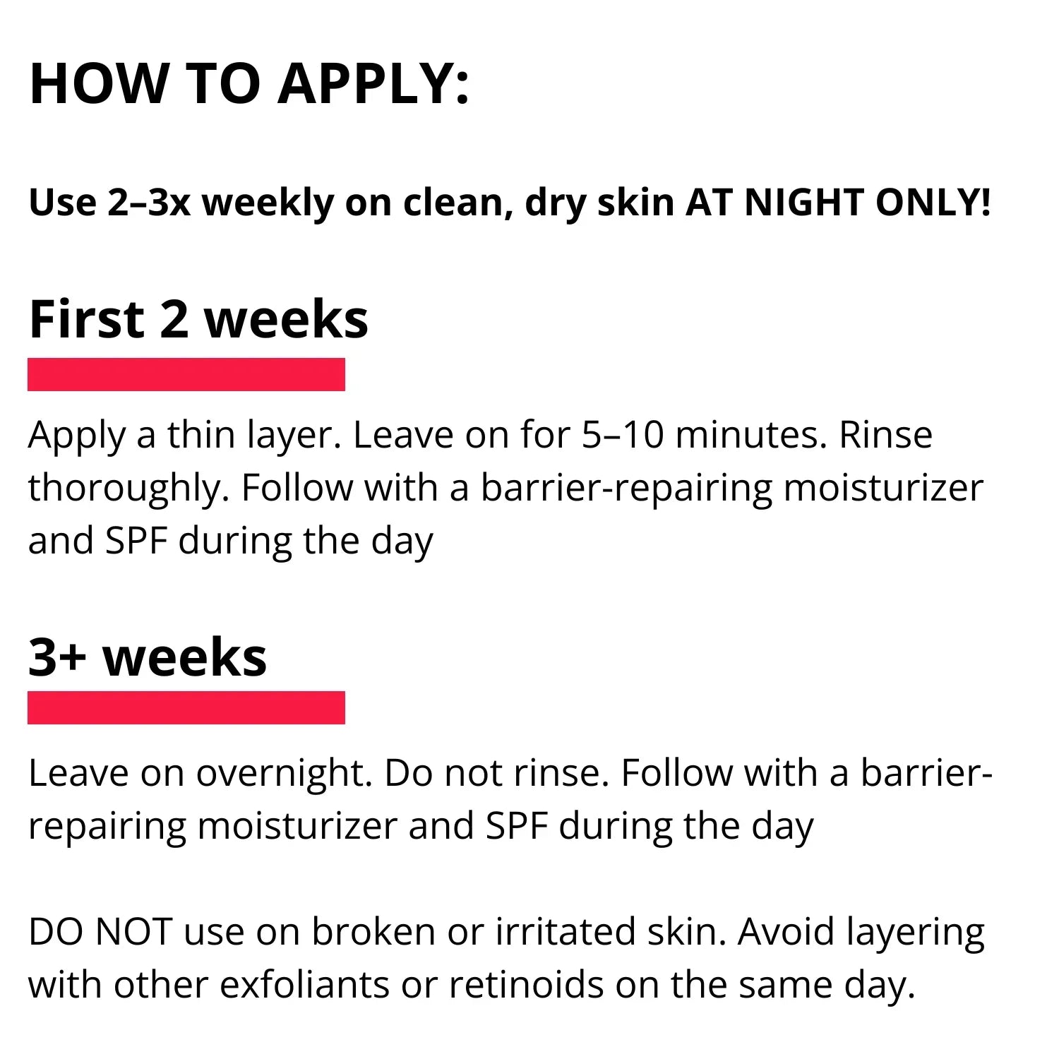 - Frecuencia: Usar 1 o 2 veces por semana. No combinar con otros ácidos fuertes ni retinoides en la misma rutina.