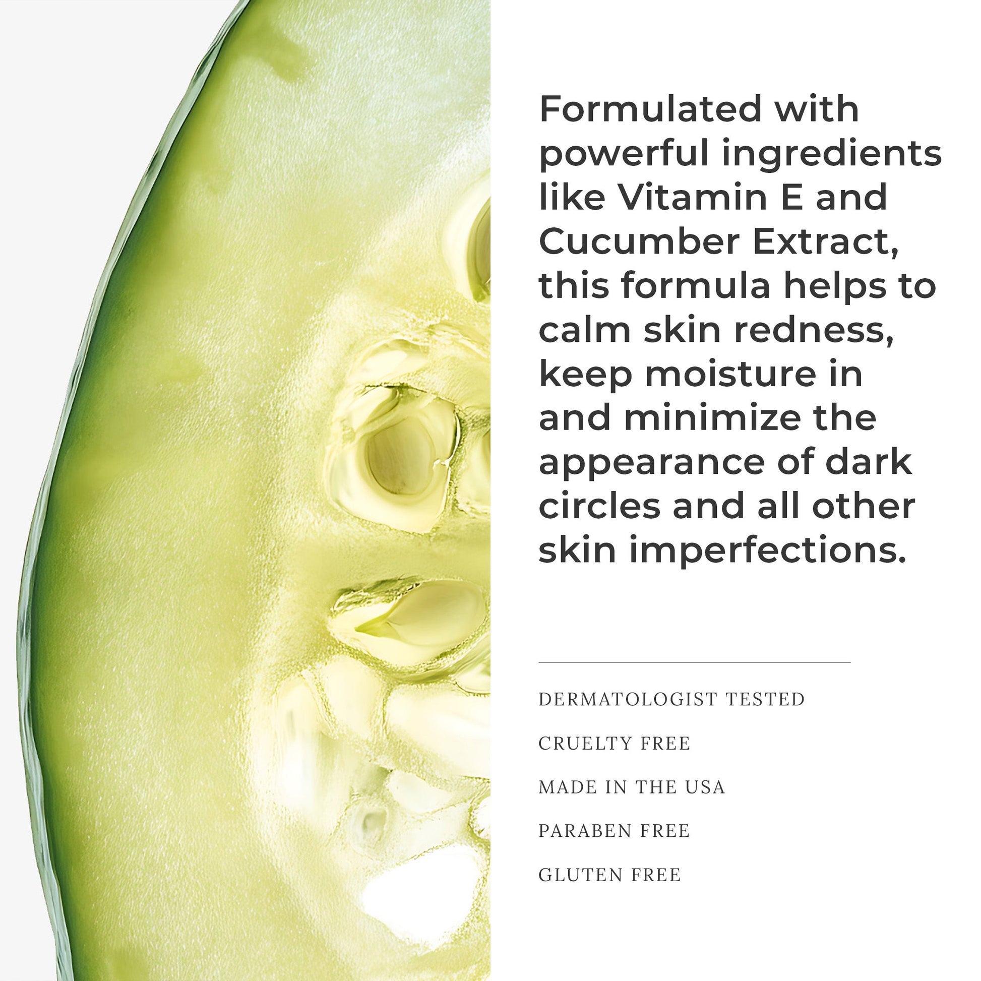 • Vitamin E protects, moisturizes and calms the skin while Cucumber Extract softens, soothes and de-puffs.