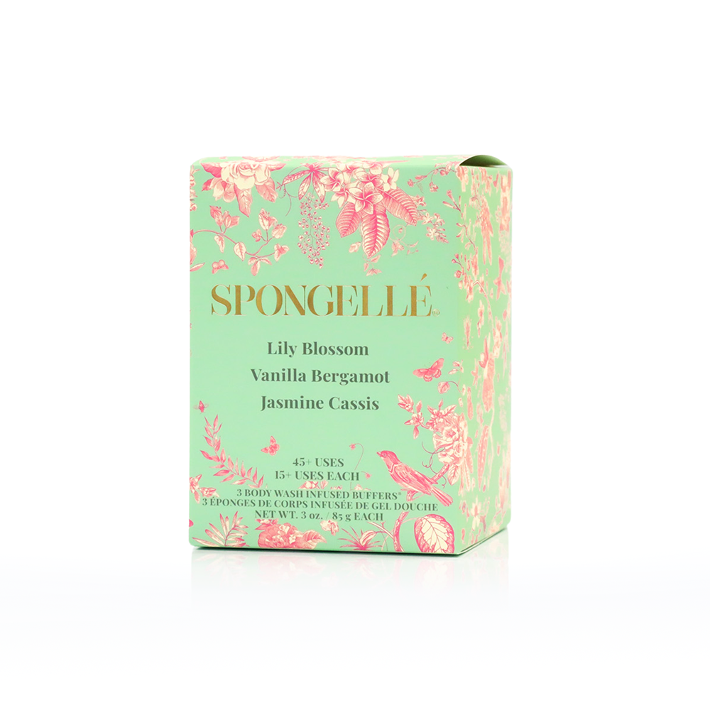 Body Buffer Trio Set includes 3 full size Body Wash Infused Buffers in spring-themed Lily Blossom, Vanilla Bergamot, and Jasmine Cassis. Each pre-filled body wash buffer is good for 15+ uses each.