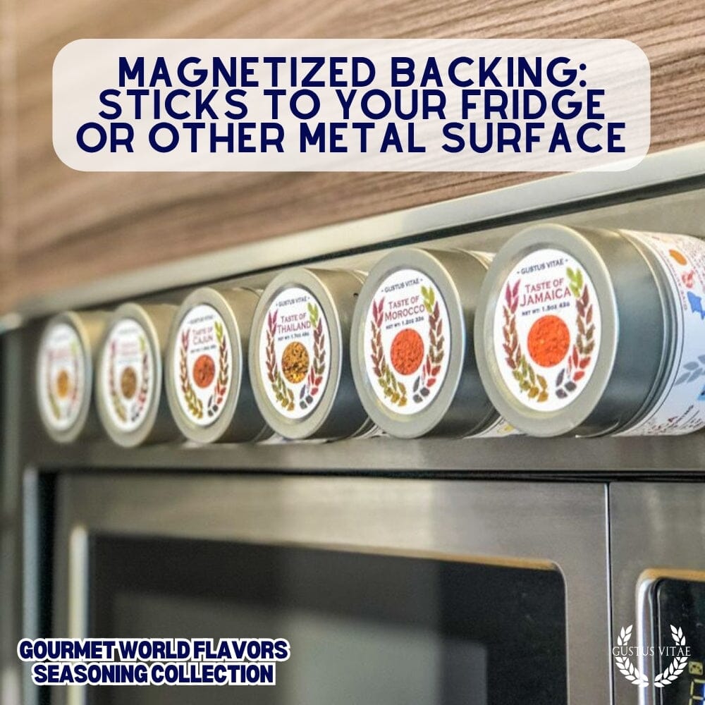 • Magnetized backing: tins sticks to your fridge or other metal surface.