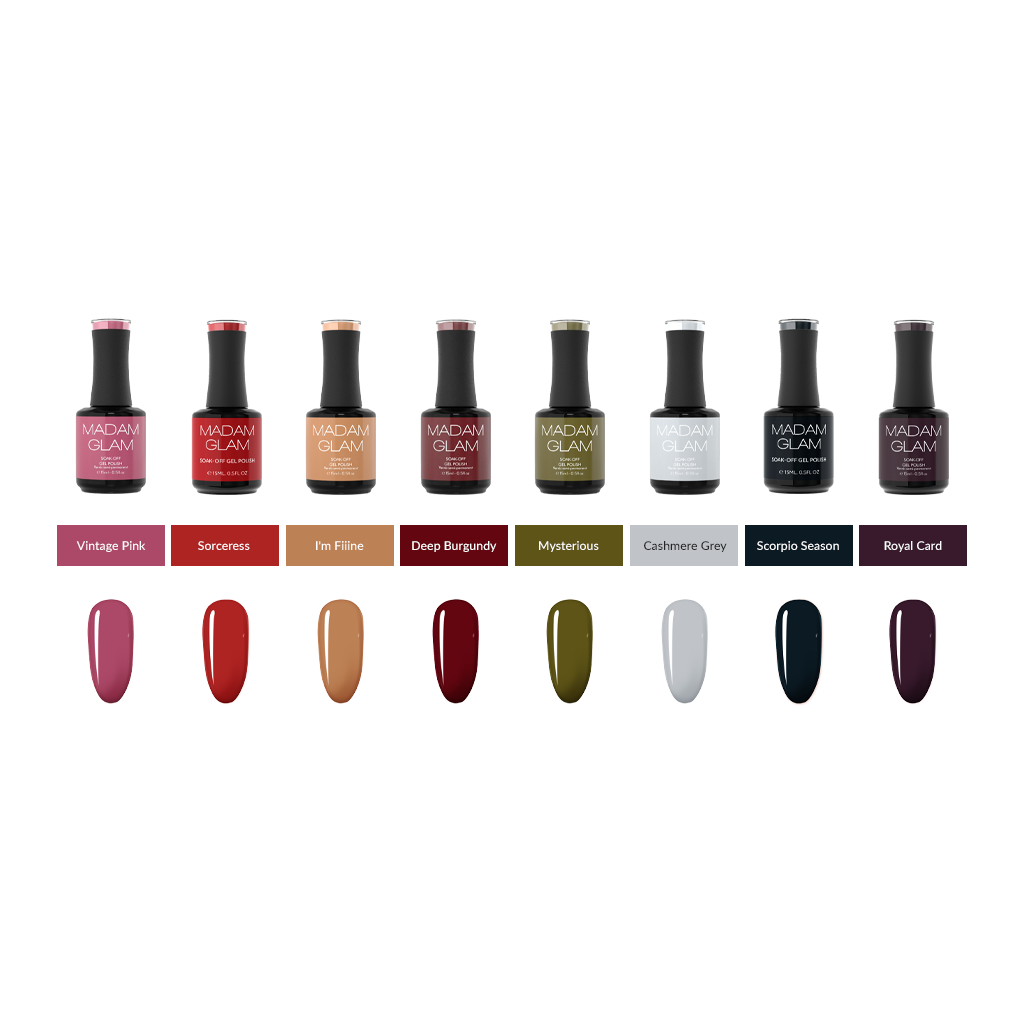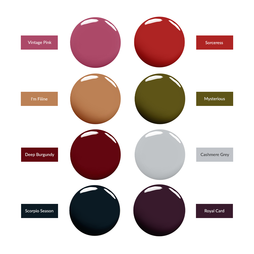 The Bundle conatins the following shades: Vintage Pink | Sorceress | I'm fiiine | Deep Burgundy | Mysterious | Cashmere Grey | Scorpio Season | Royal card