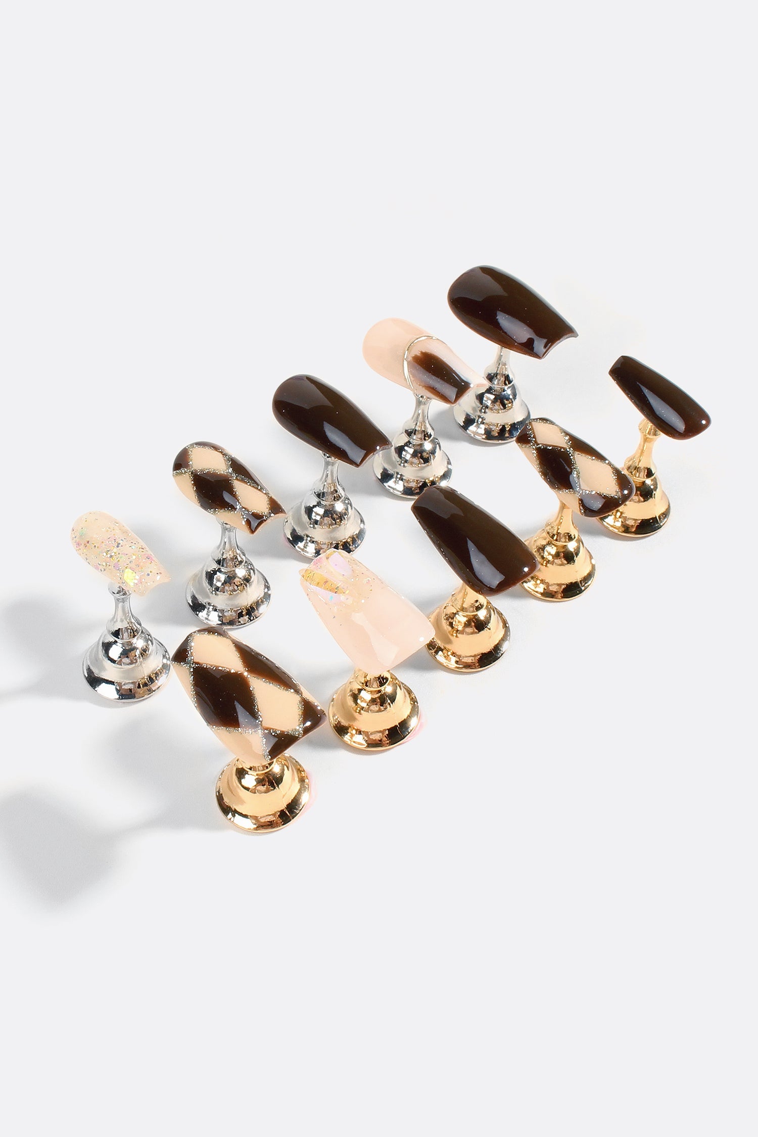 Embrace elegance with the Preppy Aesthetic handmade nail set, a masterclass in sophisticated style. Each nail features a deep brown base, evoking the richness of classic luxury. The crisp check patterns are enhanced with a shimmer of gold glitter, adding an exquisite touch of glamour. To complete the ensemble, a subtle shell accent adorns each piece, reminiscent of classic high-end fashion—merging timeless elegance with contemporary sparkle.