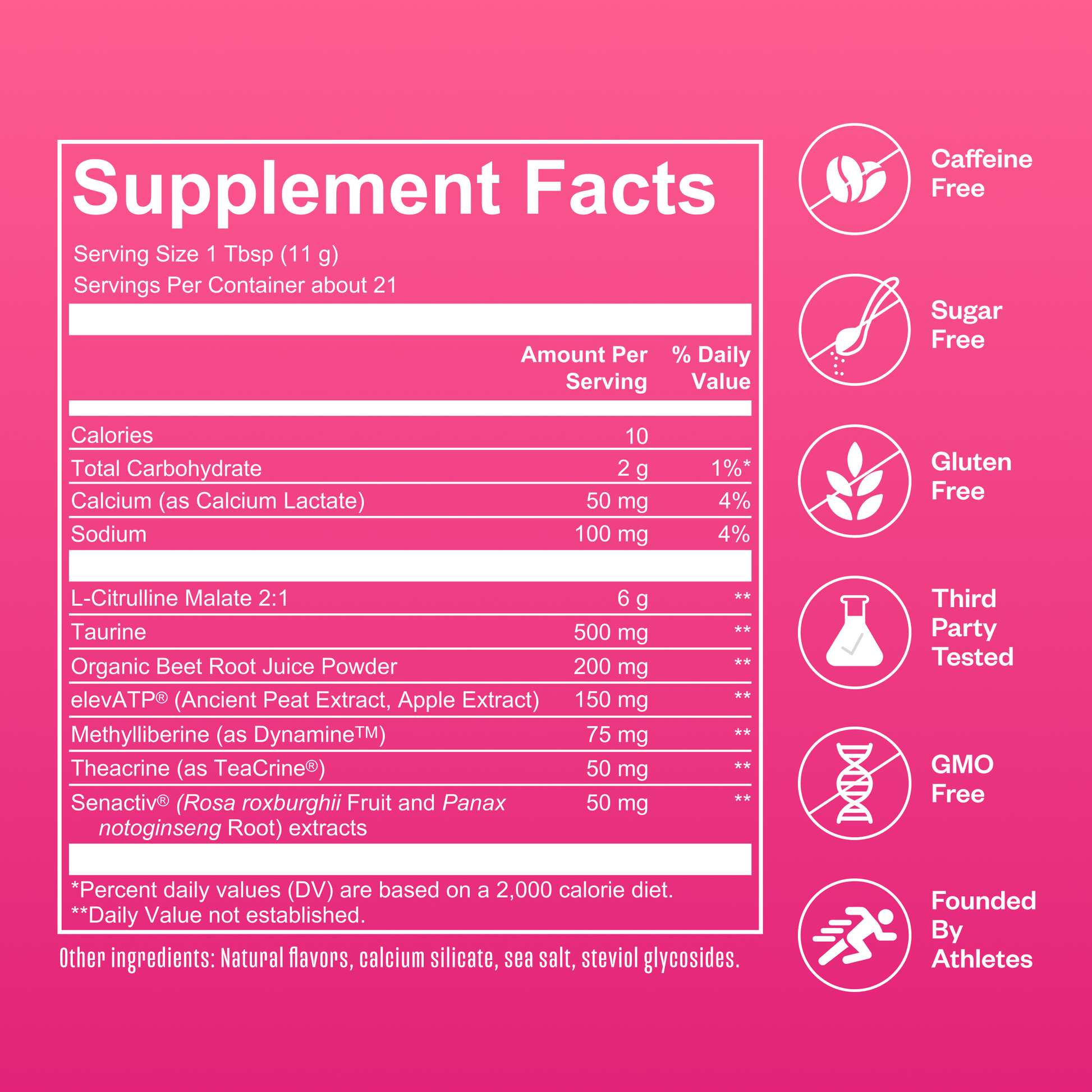 Calcium, Sodium, L-Citrulline Malate, Taurine, Organic Beet Root Juice Powder, elevATP®(Ancient Peat Extract, Apple Extract), Methylliberine (Dynamine™), Theacrine (TeaCrine®), Senactiv®