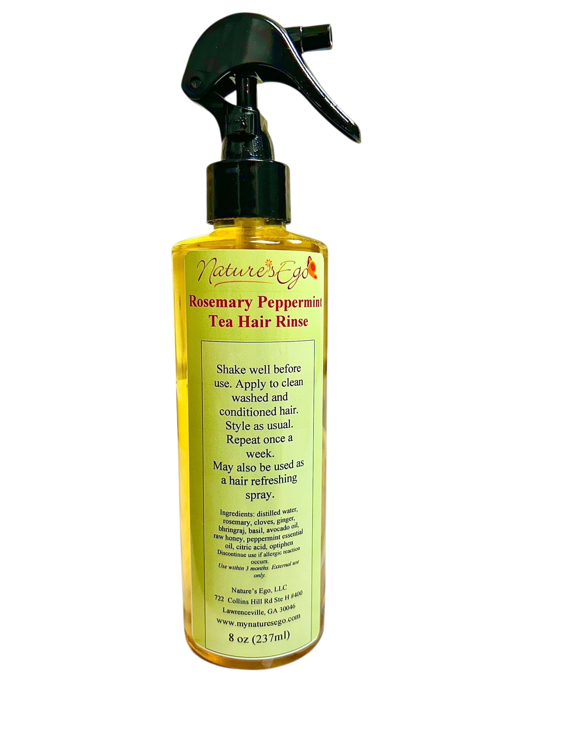 A Rosemary & Peppermint Tea hair rinse. The rinse provides a refreshing, tingling sensation. Formulated with rosemary, cloves, ginger, bhringraj, basil, and avocado oil. Non oily, all hair types. Cinnamon bark essential oil is also added.