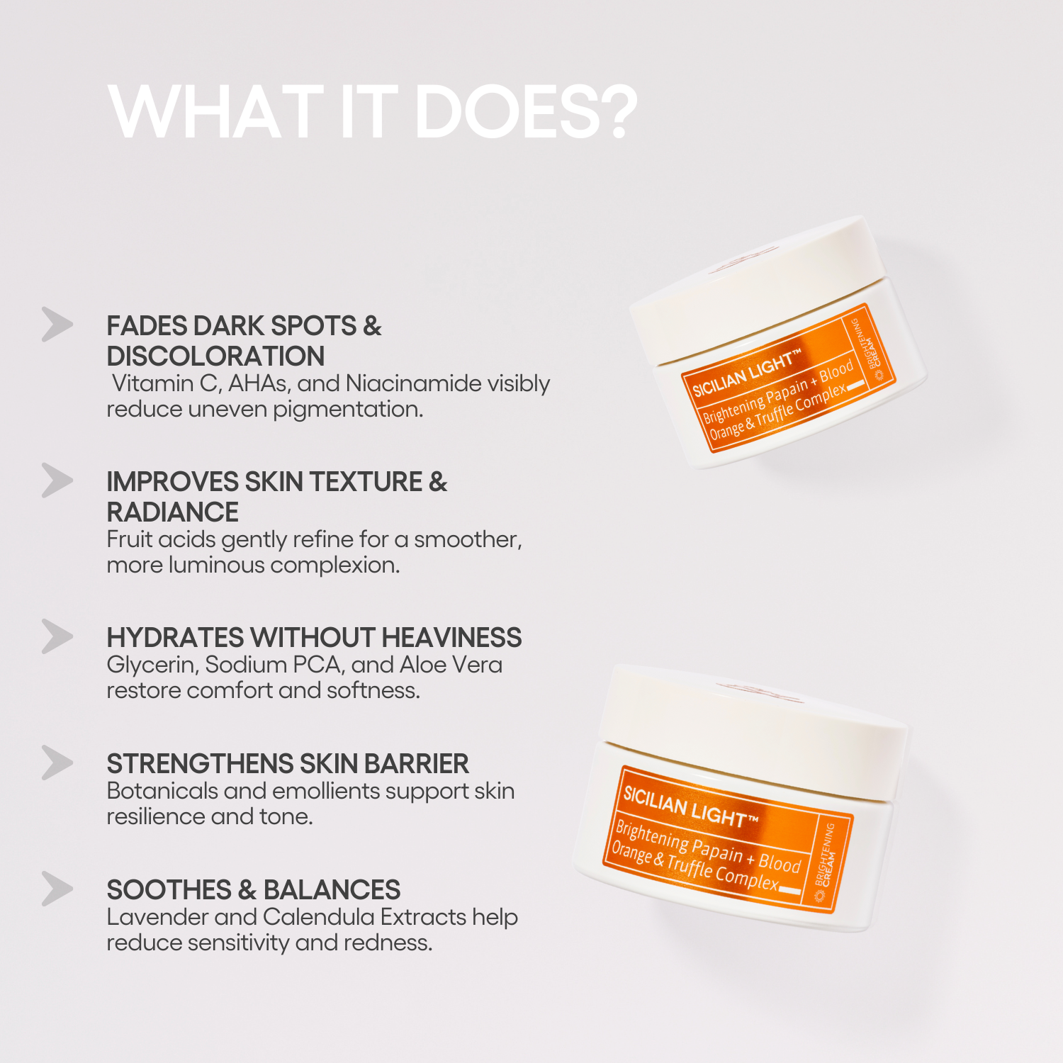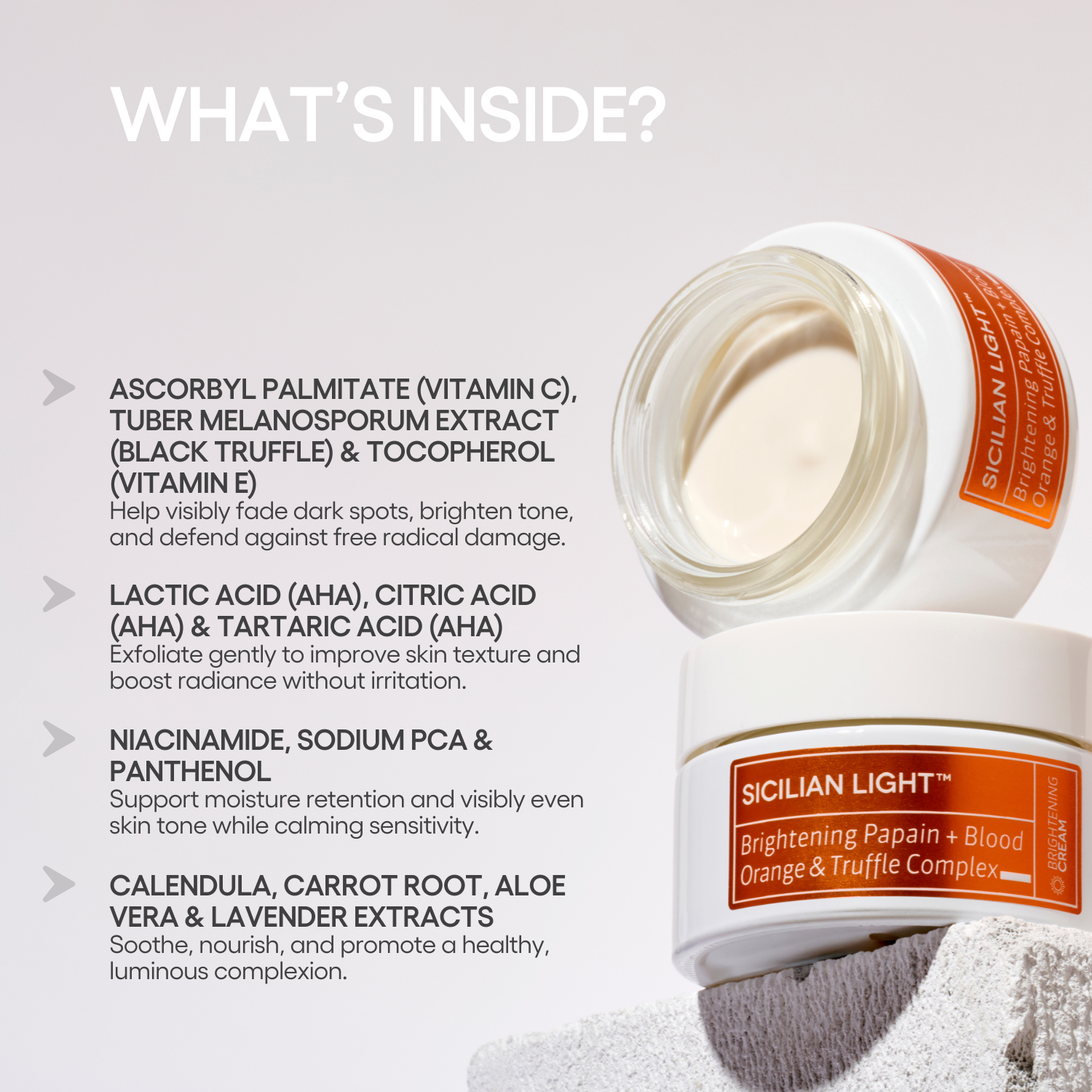 A transformative cream that brightens, plumps, and restores radiance with a Truffle + Vitamin C complex, 24 Sicilian botanicals, hyaluronic acid, and plant-based squalane. It minimizes dark spots, evens skin tone, and strengthens hydration, leaving a luminous, resilient, and visibly healthy-looking complexion.