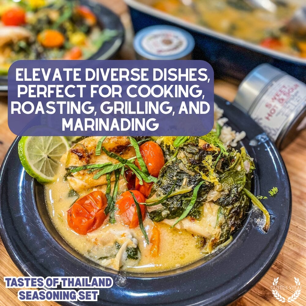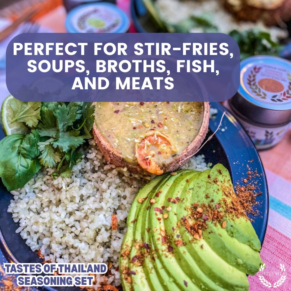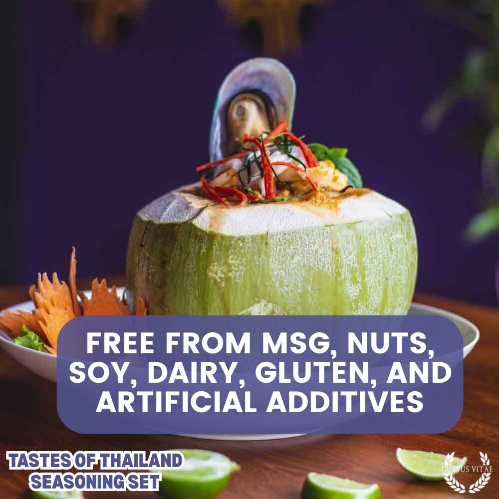 • Spicy Thai Seasoning: California Sea Salt, Ginger, Basil, Red Pepper, Cumin, Cardamom, Black Pepper, Garlic, Onion, Red Bell Peppers, Cilantro, Turmeric Extract and Garlic Oil.