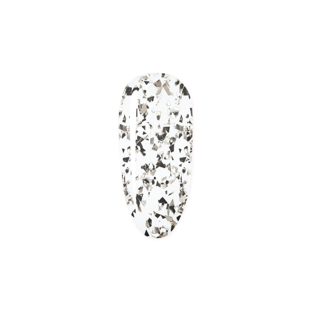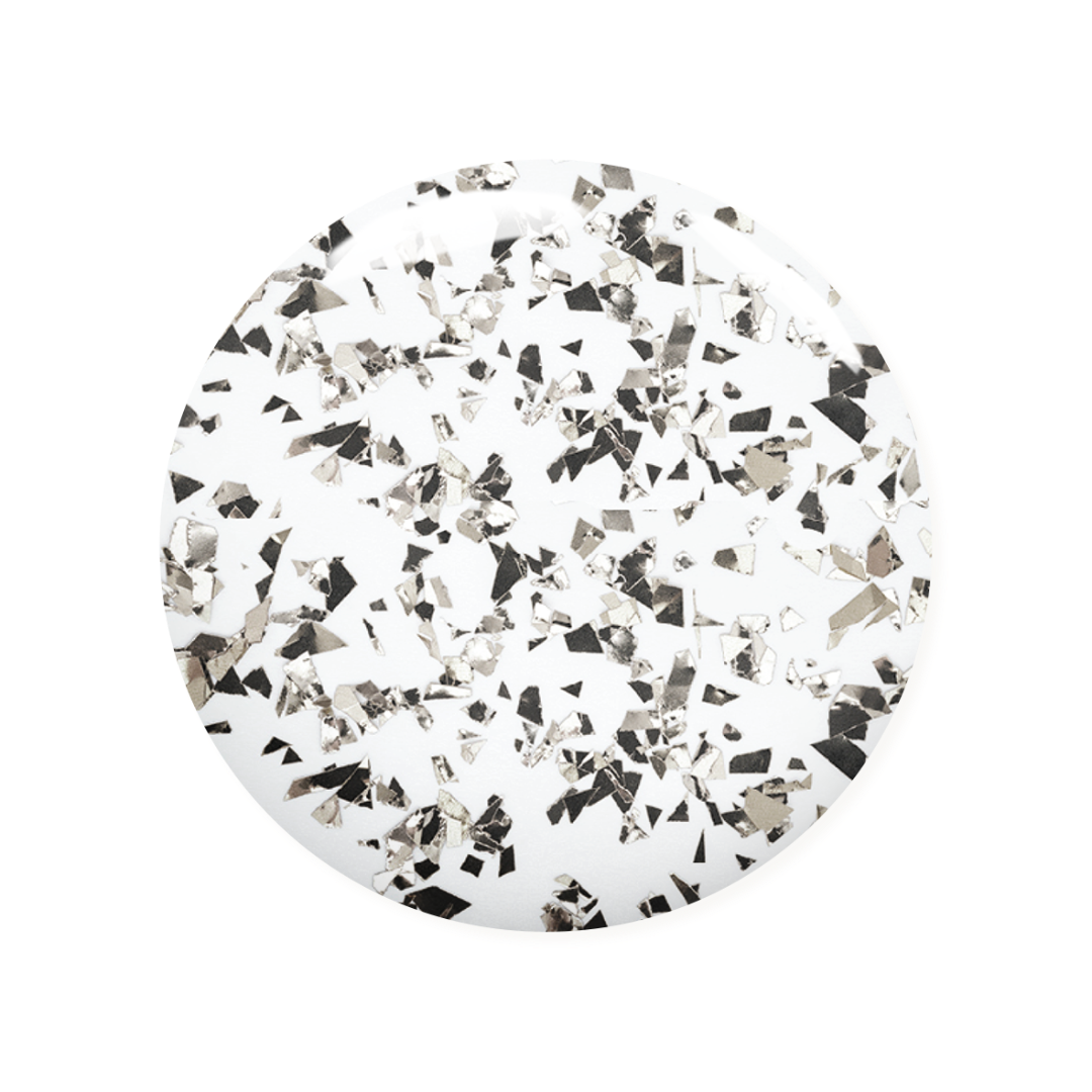 Shiny Top Coat with Silver Flakes with varying sizes of silver flakes