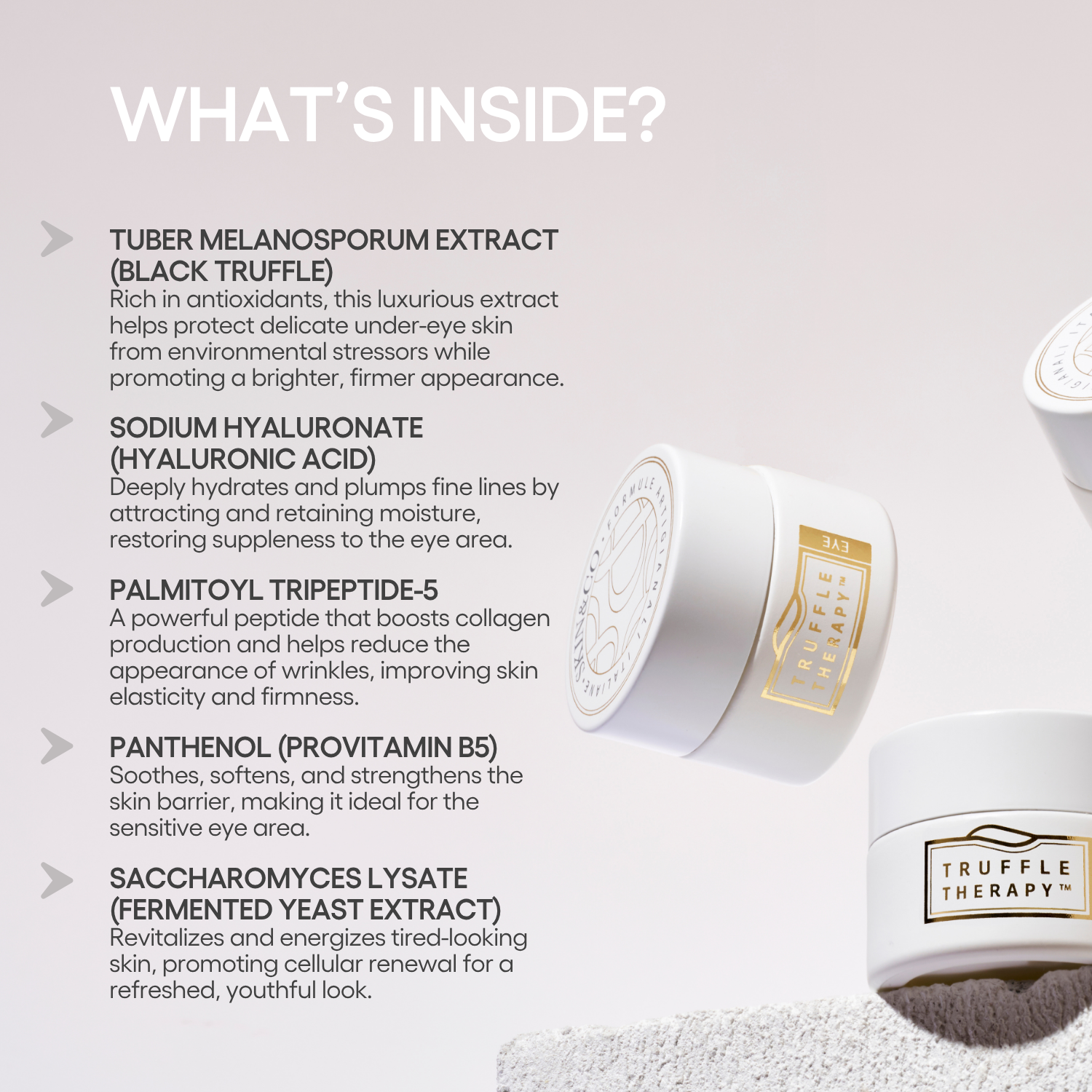 This lightweight, intensive eye concentrate brightens and hydrates delicate under-eye skin. Enriched with Black Truffle from Umbria, peptides, hyaluronic acid, and niacinamide, it reduces puffiness, softens fine lines, and restores suppleness, leaving eyes visibly lifted, luminous, and refreshed with every application.