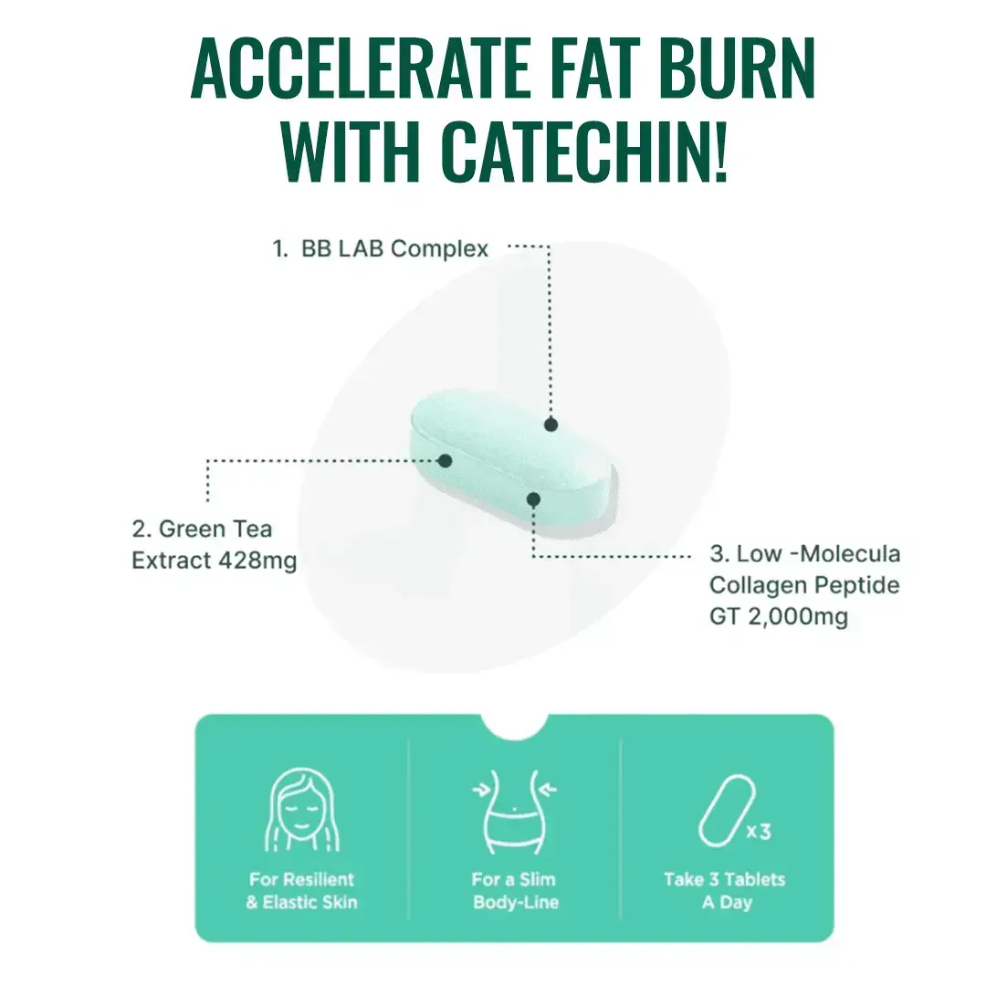 | Ingredients | Green tea extract (70% Catechins), Low Molecular Fish Collagen, Microcrystalline Cellulose, Hydroxypropylmethyl Cellulose, Silicon Dioxide, Magnesium Stearate, Titanium Dioxide, Glycerin Fatty Acid Ester, Corn Protein Powder, (Gardenia Green Colour, Gardenia Blue Colour, Dextrin, Safflower Yellow Colorant), Garcinia Cambogia Husk Extract, L-Carnitine, (Hibiscus Powdered Extract, Hibiscus Powdered Extract, Maltodextrin), (BB LAB Complex, Grape Extract Powder, L-Arginine, L-Glutamic Acid, Star Anise Extract Powder, Ginger Extract Powder, Haematococcus Extract Powder, Aloe Vera Extract Powder), (Gardenia Yellow Colour, Gardenia Yellow Colour, Maltodextrin) |