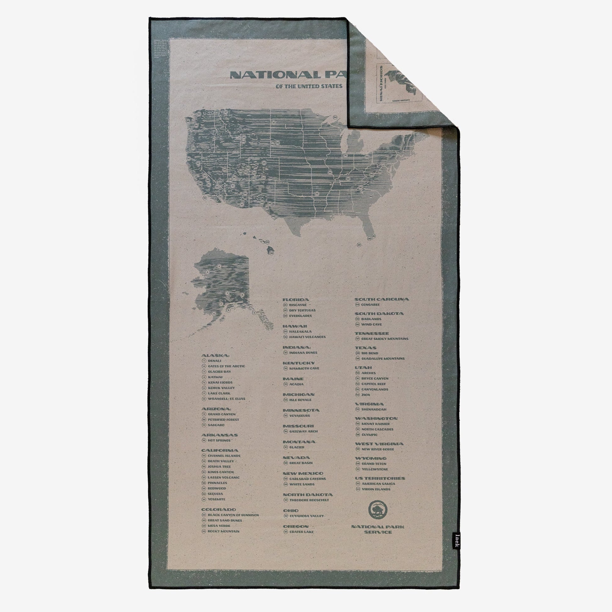Inspired by the US National Parks, this vintage design features a map of the parks on the front and displays each park’s acreage, shape, and year of founding on the back.