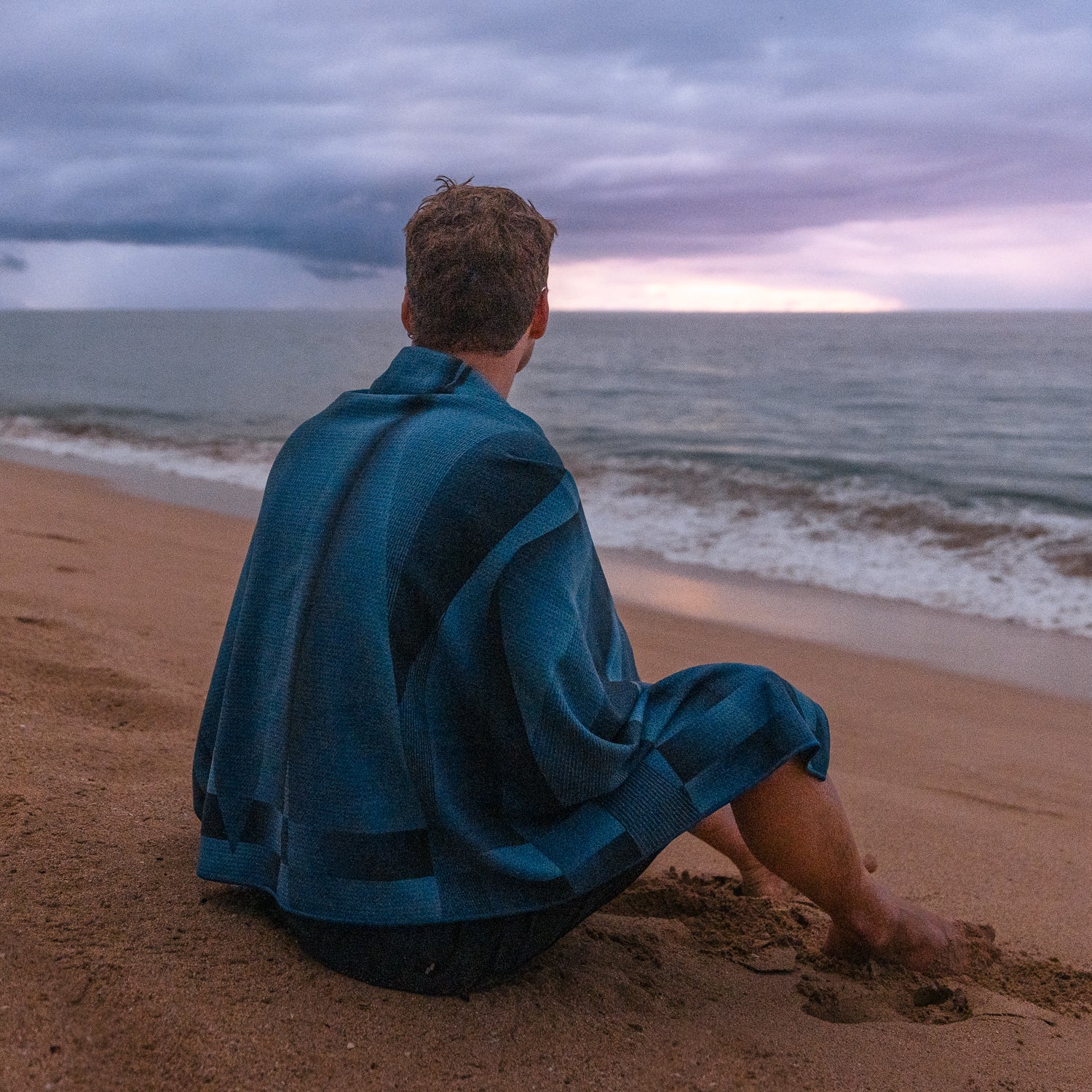 Inspired by the hues reflecting on water moments just before dark. The design features a deep blue ocean texture that is an ode to the last bit of visible light.