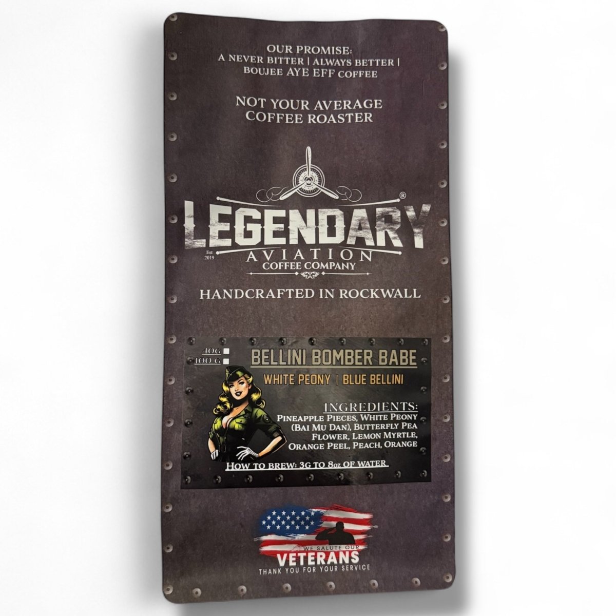 Strap in and prepare for takeoff into flavor paradise with Bellini Bomber Babe, a bold and vibrant fruit-forward white tea blend that’s as dazzling as a pin-up girl on the nose of a WWII bomber. Infused with juicy peach, citrus zest, and the mesmerizing blue hue of butterfly pea flower, this tea is as smooth as it is striking. Whether served hot or iced, it’s a mission-ready sip that’ll leave you floating on cloud nine.