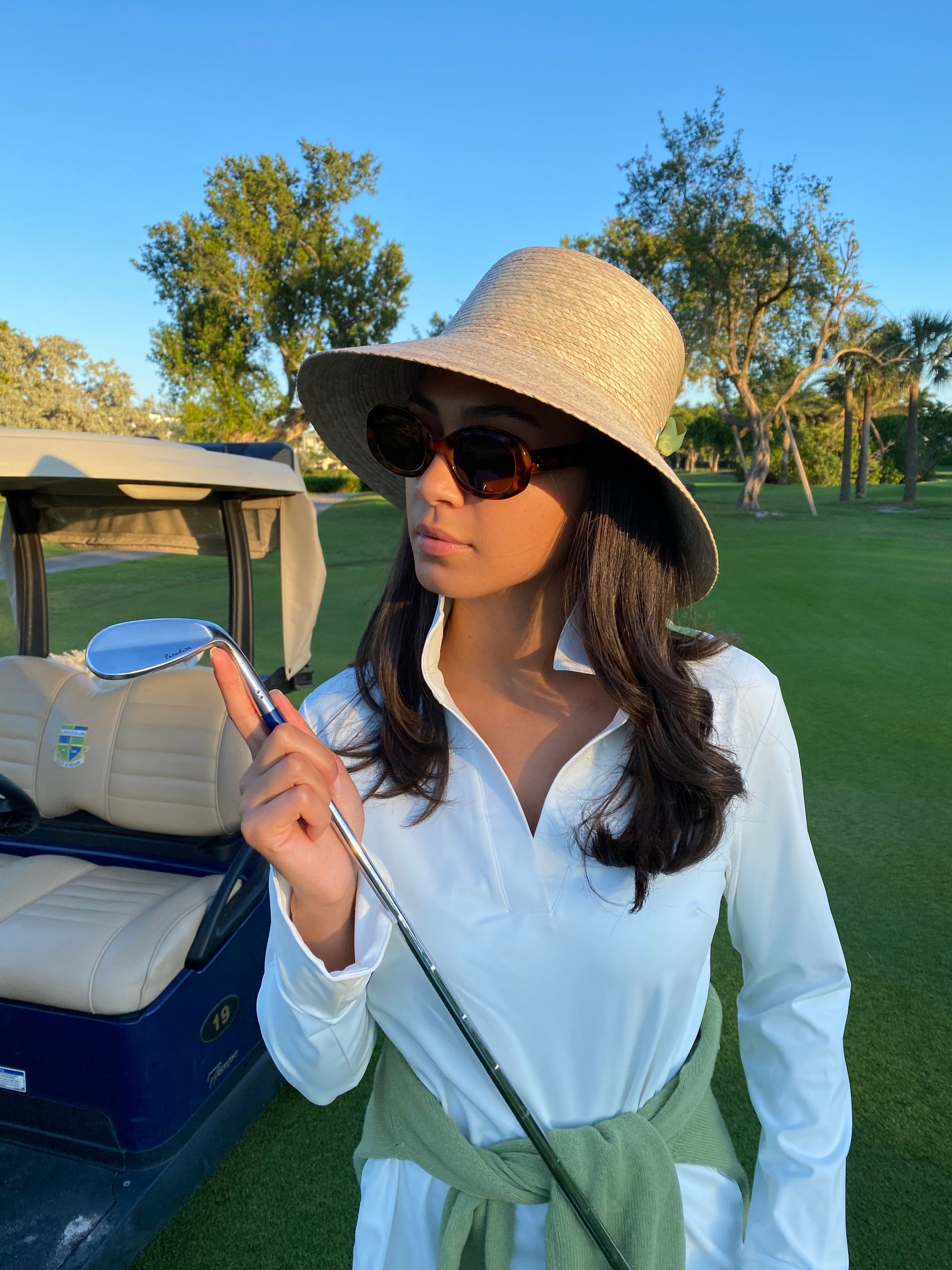 Woven with palm tree leaves, this sun is shaped in the style of a classic bucket hat.