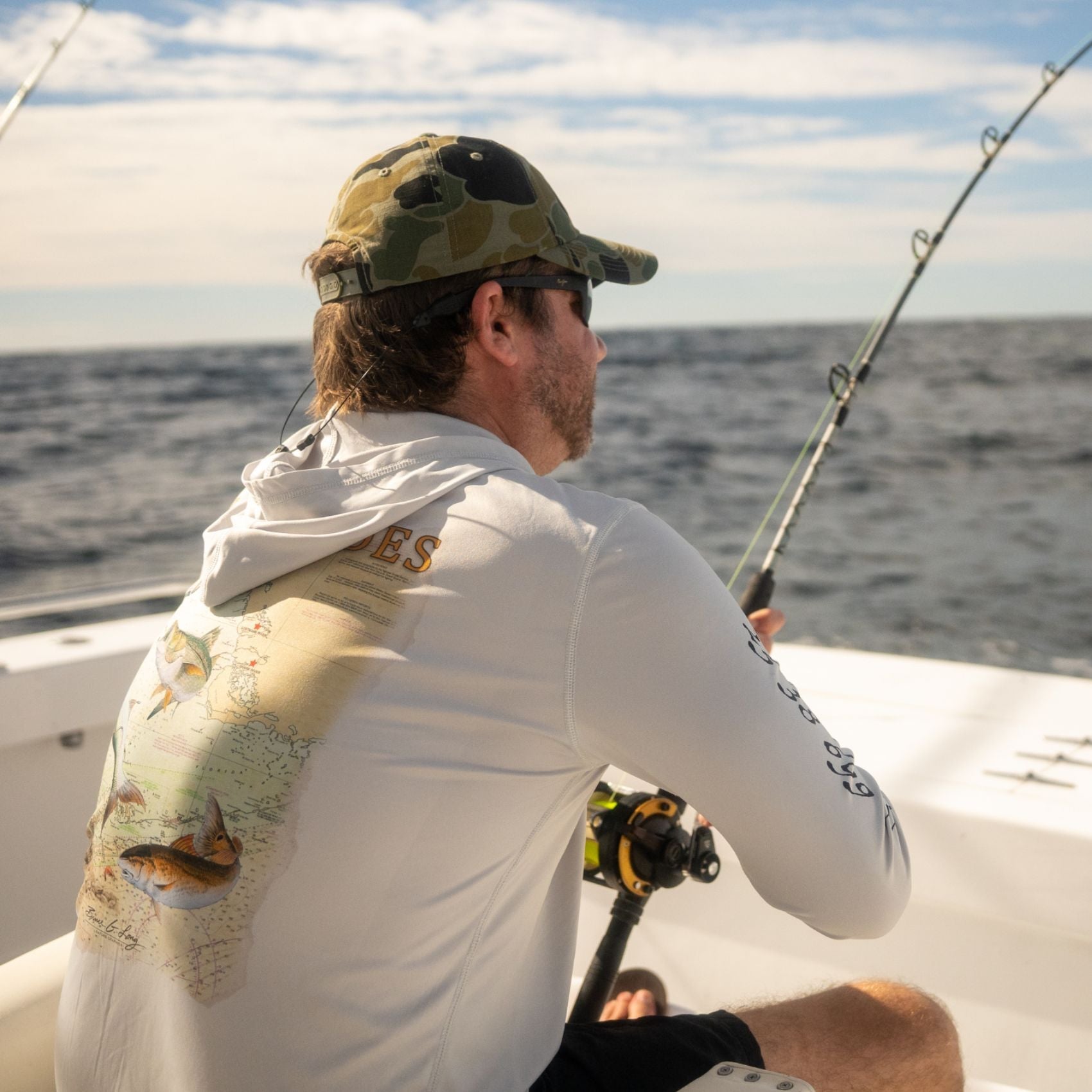 The coastal camo design was inspired by the marsh colors along the Atlantic Ocean. We are not huge into camo, but just the right amount goes with anything! The material is a performance rip stop that is incredibly lightweight and breathable for those hot days!